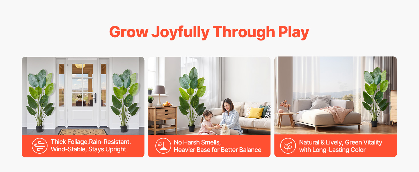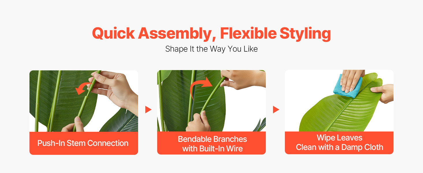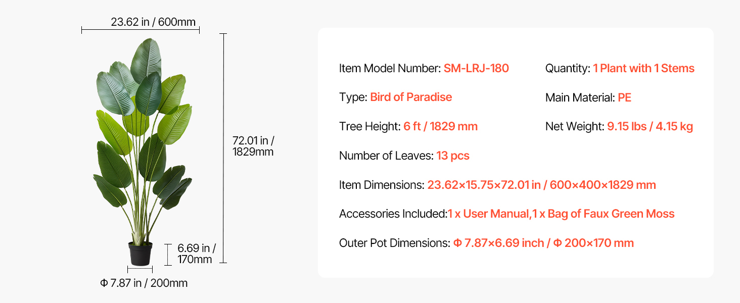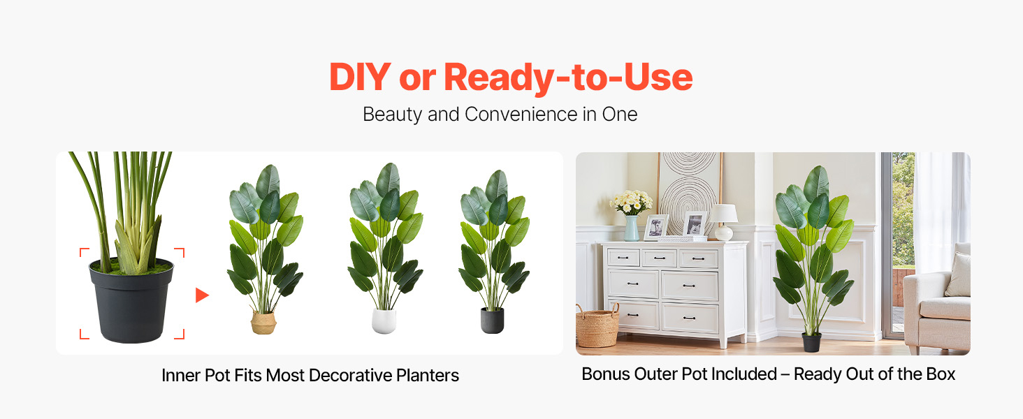 Includes four varieties of tropical plants: robust-trunk areca palm, dracaena, areca palm, and bird of paradise. Stands between 4 to 6 feet tall with lifelike PE foliage. Designed to be waterproof, suitable for low-light areas, easy to maintain, and hassle-free.