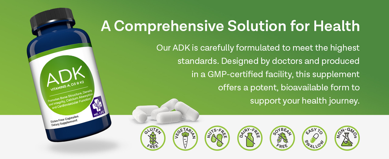 Studies also suggest that Vitamin D may only be able to activate with cooperation of Vitamin A, so it's important to choose a supplement like MD Life's ADK that has all three together.* When you purchase from MD Life, you can be sure you're getting a Doctor-designed product that was made with your whole health in mind. Our formula is carefully balanced to allow the right activity between the three Vitamins, ensuring effectiveness and max absorption .