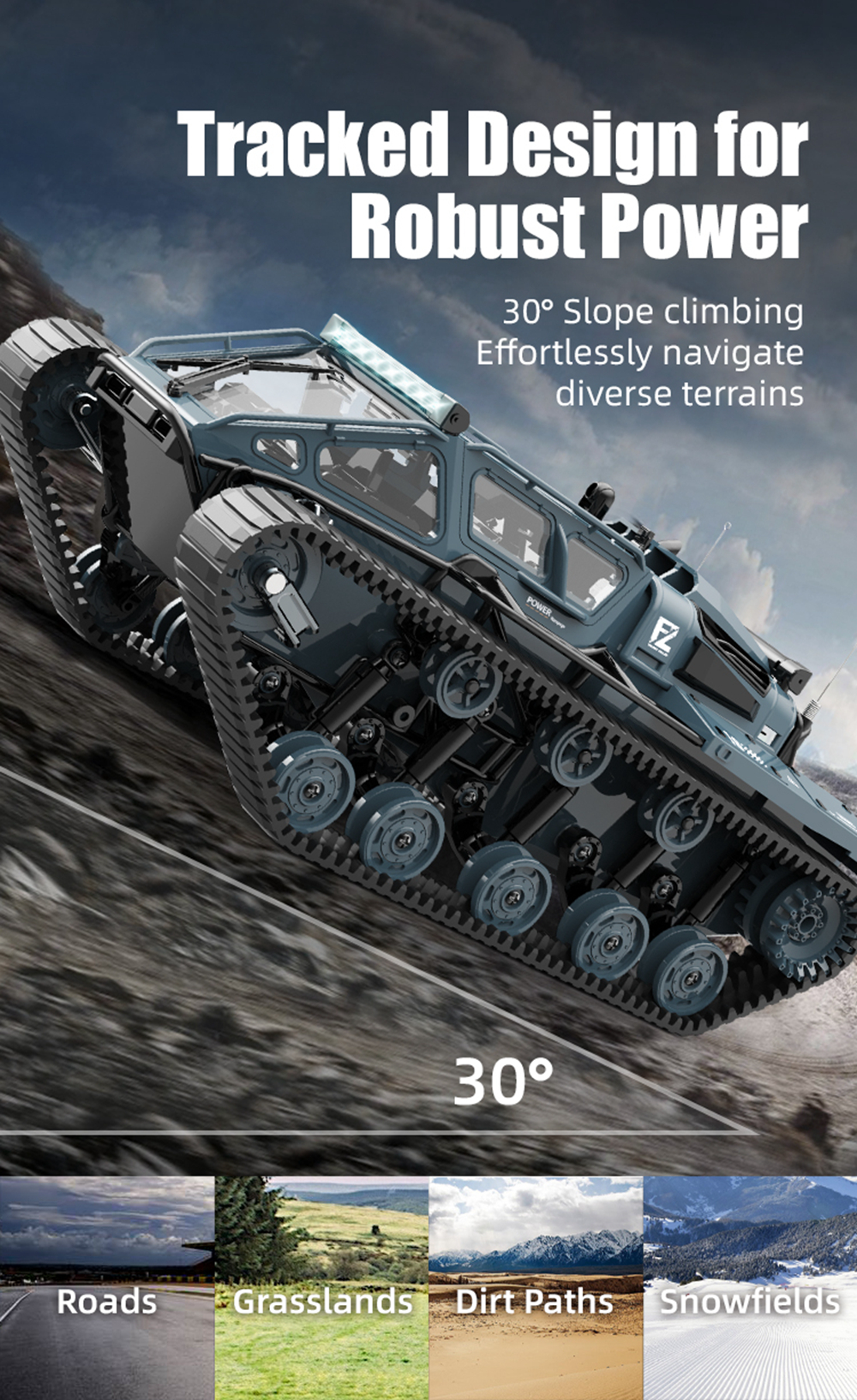1. Tracked Design for Robust Power,30° slope climbing Effortlessly navigate diverse terrains.