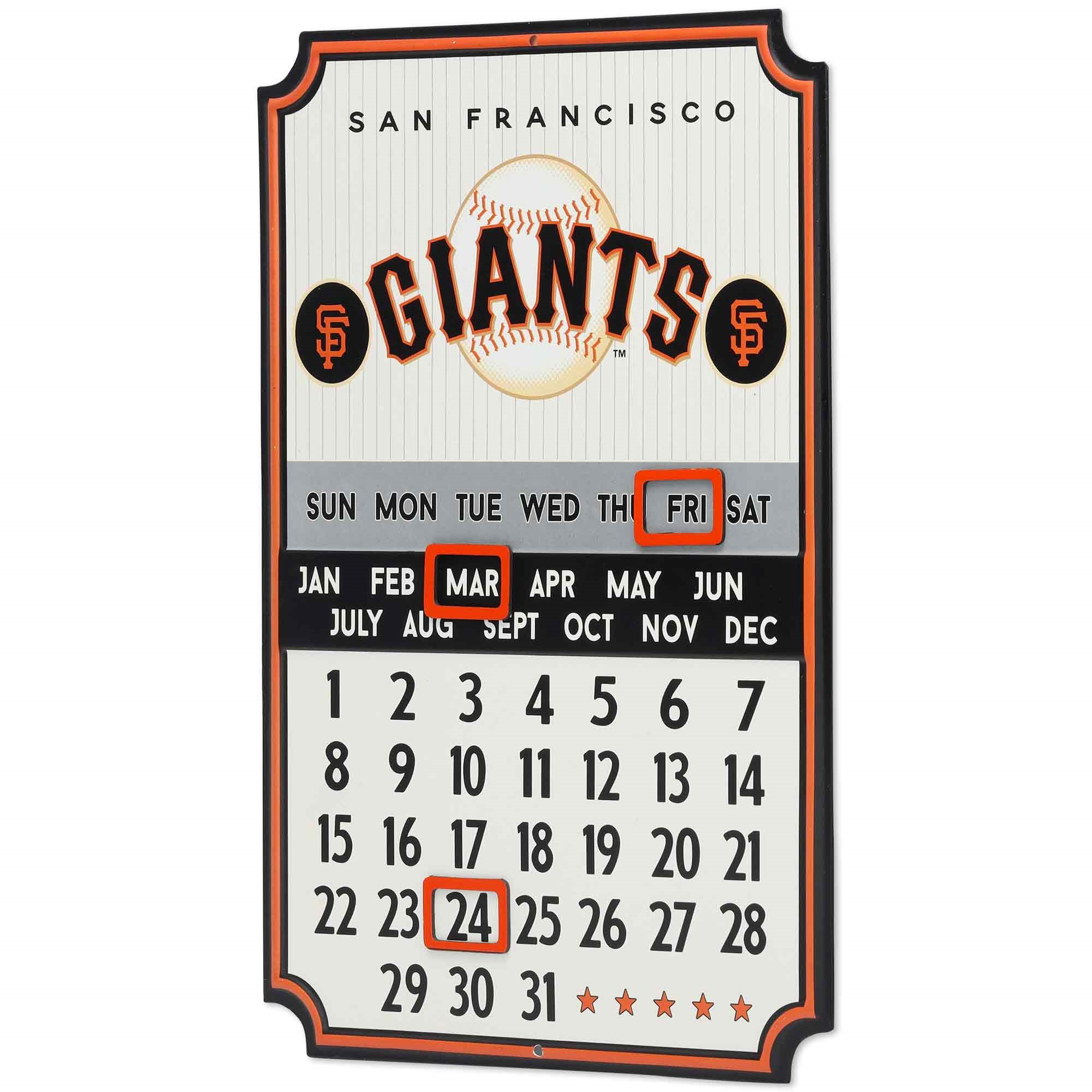 Add some San Francisco Giants spirit to your home with this unique wall calendar. With each day and month listed, it's easy to mark today's date in a while displaying your baseball fandom in this vintage inspired metal calendar. This retro-inspired wall art features team logo and colors with magnets to mark the date. It's made of tin so it's lightweight but sturdy. Officially licensed Major League Baseball merchandise. Measures 10" W x 14" H.