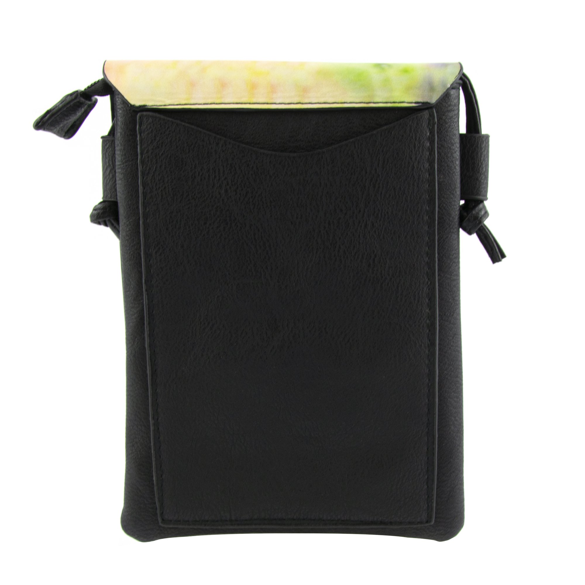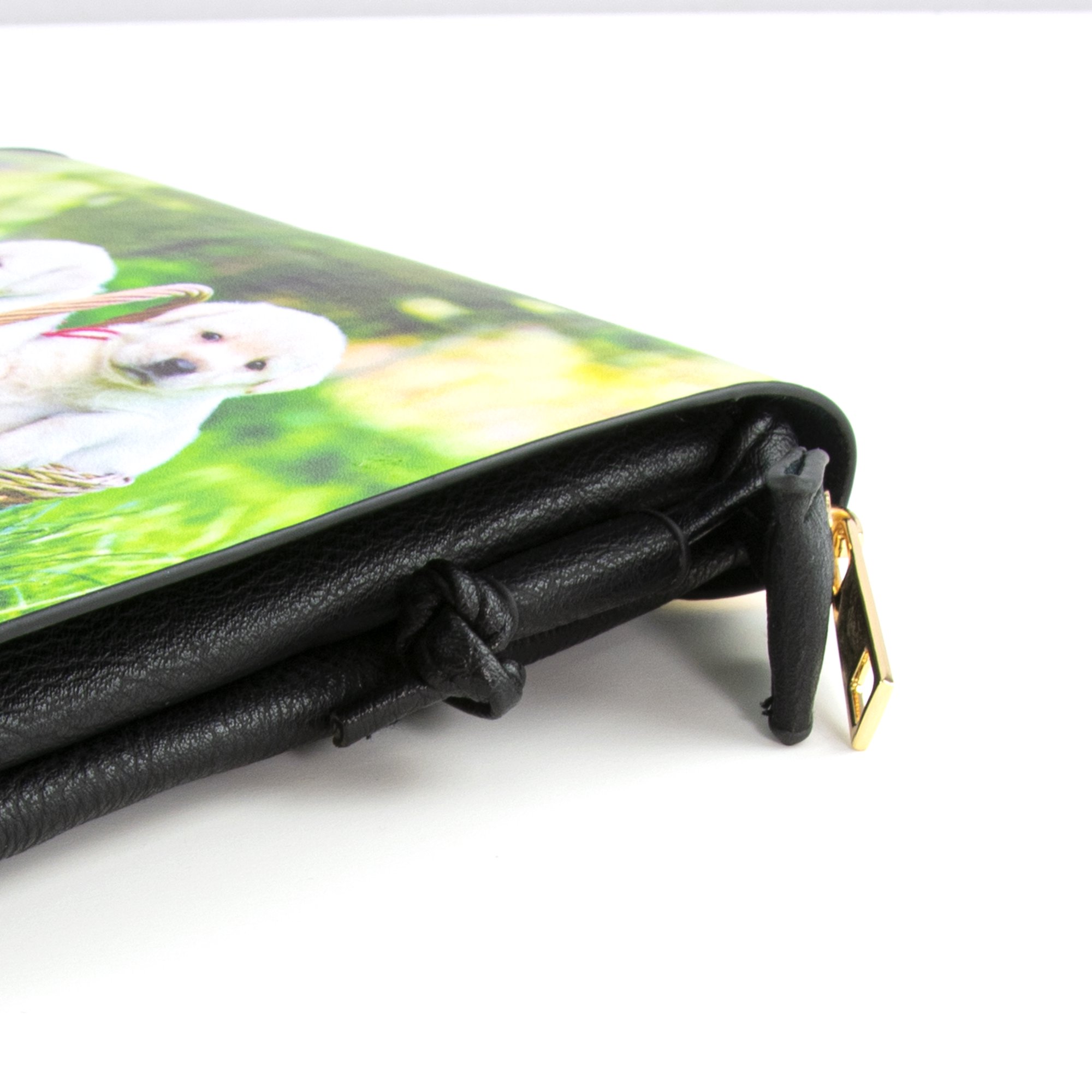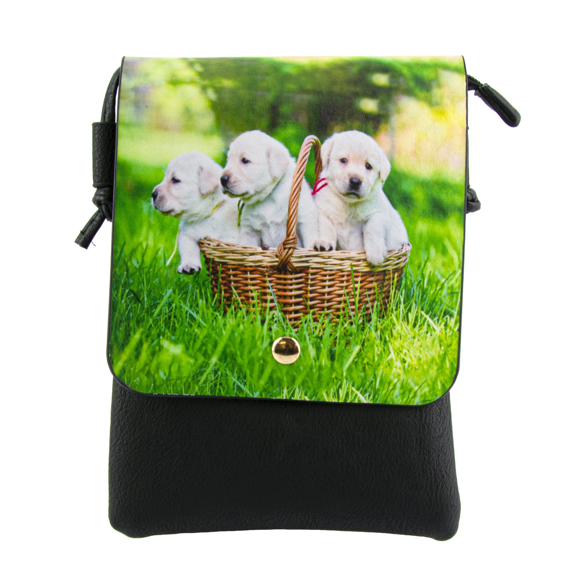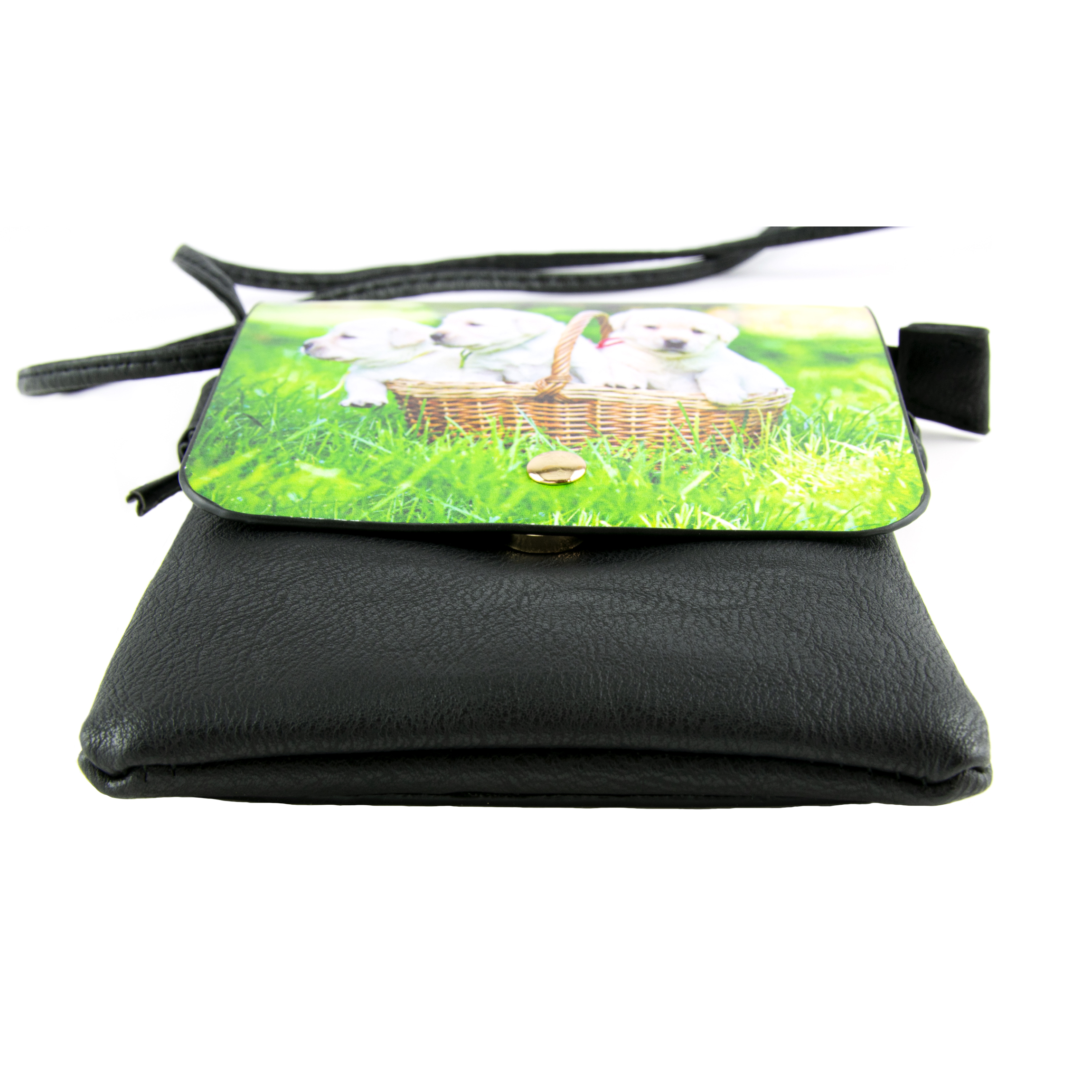 This small crossbody bag features an adorable puppy photograph printed on a faux leather (PU) black shell. The back of the purse has a slip pocket, perfect for quickly storing a cell phone or other small items. The main compartment is lined and has a zip closure ensuring your items stay safe, as well as a front flap with magnetic snap closure. Dimensions: 5-3/4" W x 8" H x 1/2" D, 23" strap drop. Exterior is made of PU, lining is made from Polyester and Microfiber.