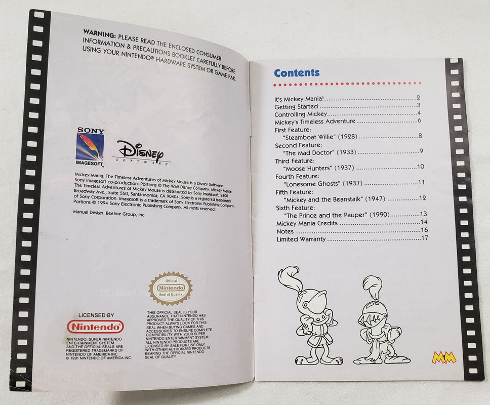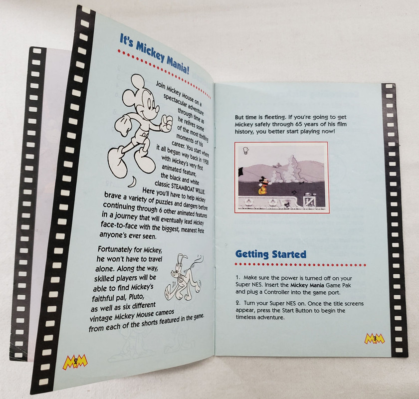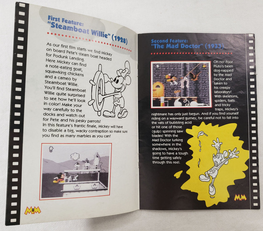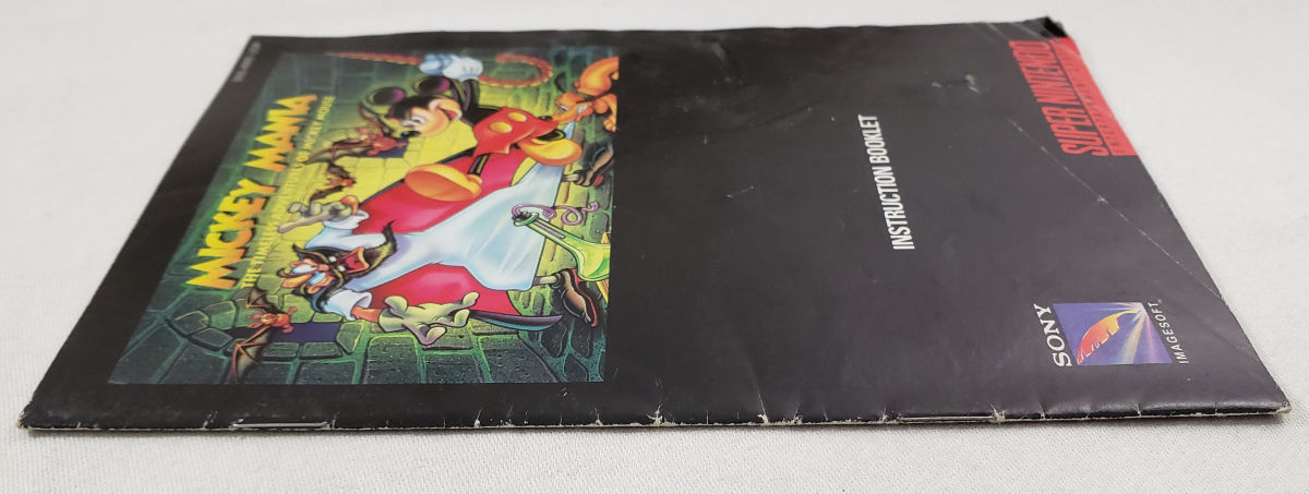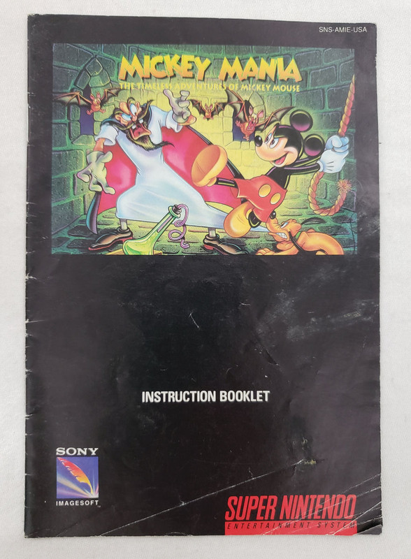 Mickey Mania Instruction Manual (SNES) No game included Only the authentic manual for Mickey Mania included. No game included. There is fraying and creasing along the spine. There is scuffing to the covers. The scuffing on the back cover is more severe. The corners of the cover have creasing. The page behind the first cover has moisture damage near the right edge. There is no writing on the pages. This will ship in a rigid package. Check out the pictures below for more detail. |