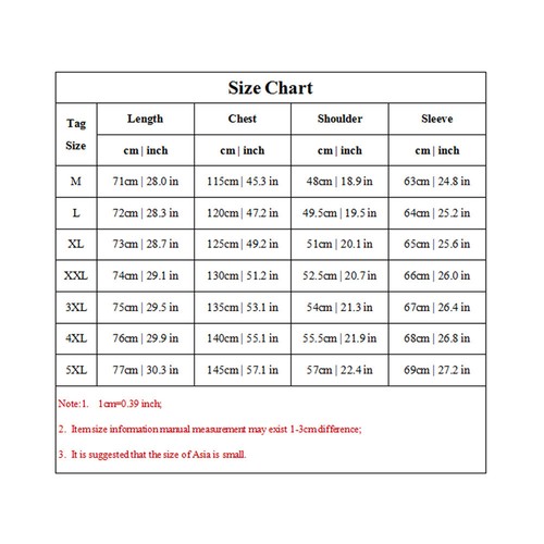 Description Feature: 100% Brand new and high quality Style: fashion,cargo Size: M,L,XL,2XL,3XL,4XL,5XL Color: black,dark grey,dark blue,coffee,army green Material: cotton blend Sleeve length:long sleeve Thickness: fleece Neckline: lapel Length: regular Pattern: solid Season: autumn,winter Occasion: everyday,daily Garment:Hand washing or machine washing,line dry. Package:1pcs coat Note: 1.Due to the light and screen difference, the item's color may be slightly different from the pictures. Please understand. 2.Please allow 2-3% error due to manual measurement.Please make sure you don's mind before you mid. 3.Size doesn's fit all.Please carefully check size chart and select the size based on your real size.