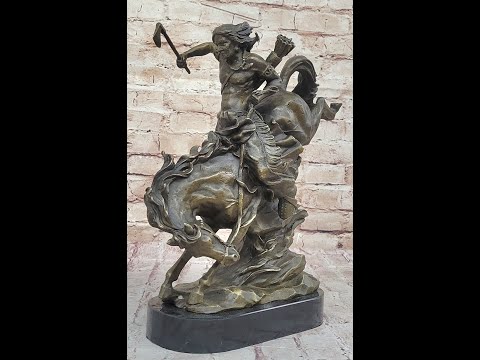 In this captivating bronze sculpture, we witness the unwavering determination of a Native American warrior and his valiant steed as they overcome an imposing obstacle. With a fierce intensity in his gaze, the warrior guides his horse to surmount the barrier with unwavering courage. The horse's body is nearly vertical, a testament to its power and agility, while the warrior holds the reins with a strong and resolute grip, maintaining balance with a formidable axe in his hand.