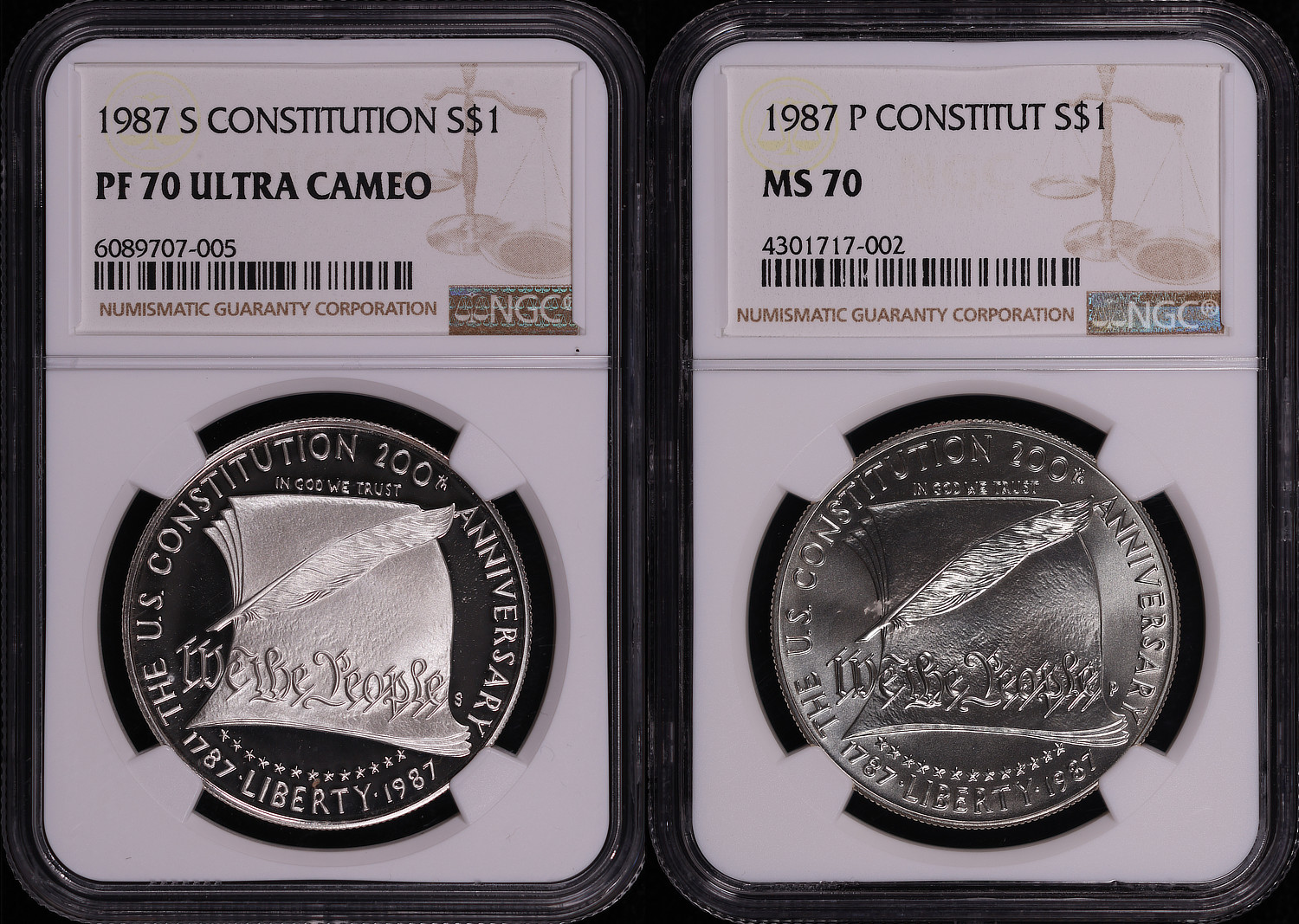 1987-P&S Constitution Silver Dollar Commemorative Set NGC MS-70 & PF-70 UC Ultra Cameo. There are some minor scuffs and scratches on the NGC holders.