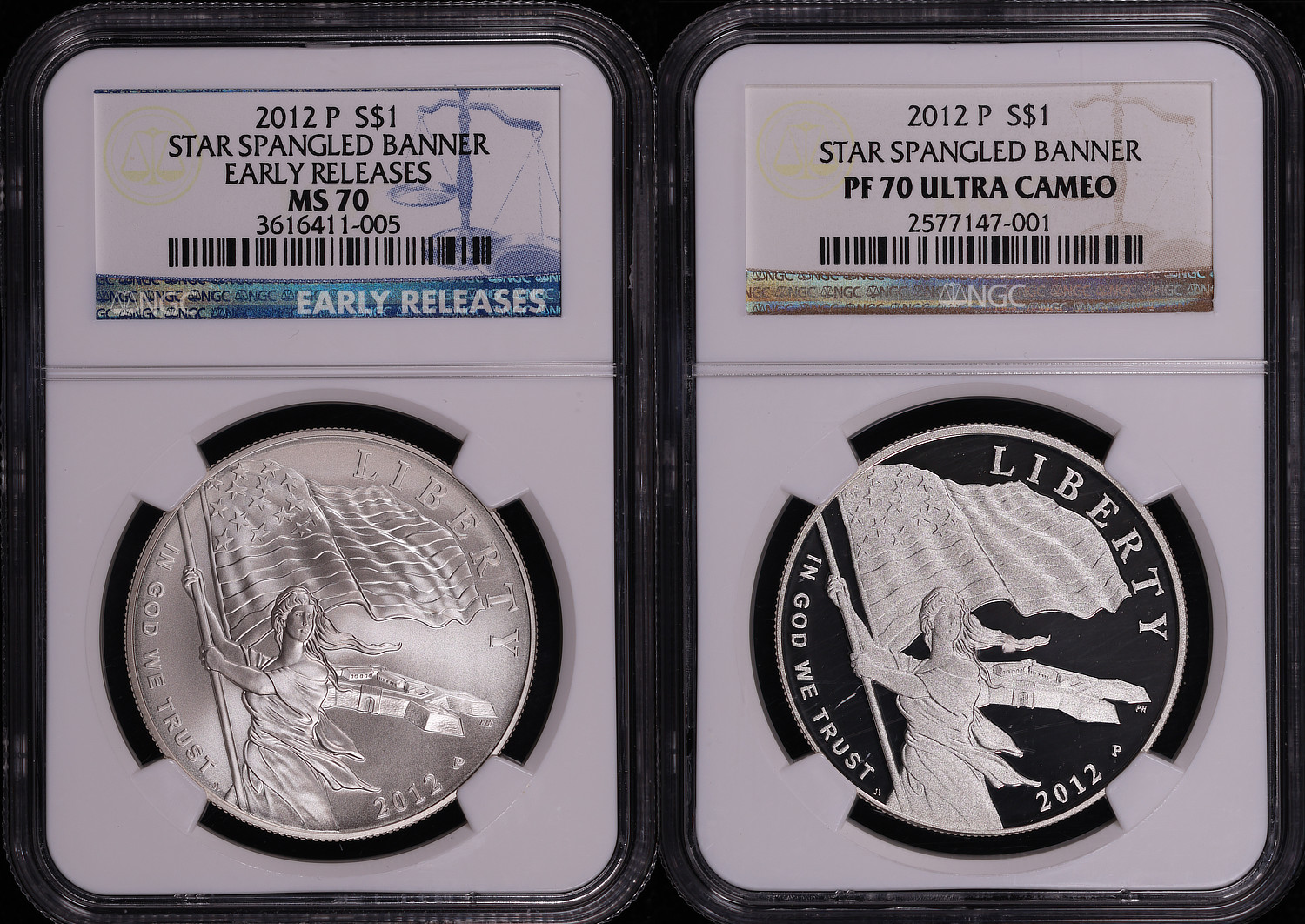 2012-P Star Spangled Banner Silver Dollar Commemorative Set NGC MS-70 & PF-70 Ultra Cameo Early Release. There are some minor scuffs and scratches on the NGC holders.