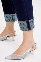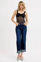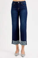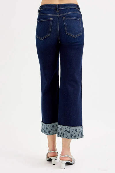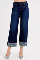 These stylish wide leg cropped jeans feature premium denim construction. The standout design element is the unique polka dot patterned cuff detail that adds a playful twist to classic denim styling. Made from quality cotton blend denim fabric, these jeans offer durability and comfort for everyday wear. The wide leg silhouette provides a relaxed, modern look while the cropped length makes them perfect for showcasing footwear. The classic five-pocket design maintains traditional jean functionality, while the contrast cuff detail sets them apart from ordinary denim. Perfect for casual outings, these jeans combine comfort, style, and unique design elements.