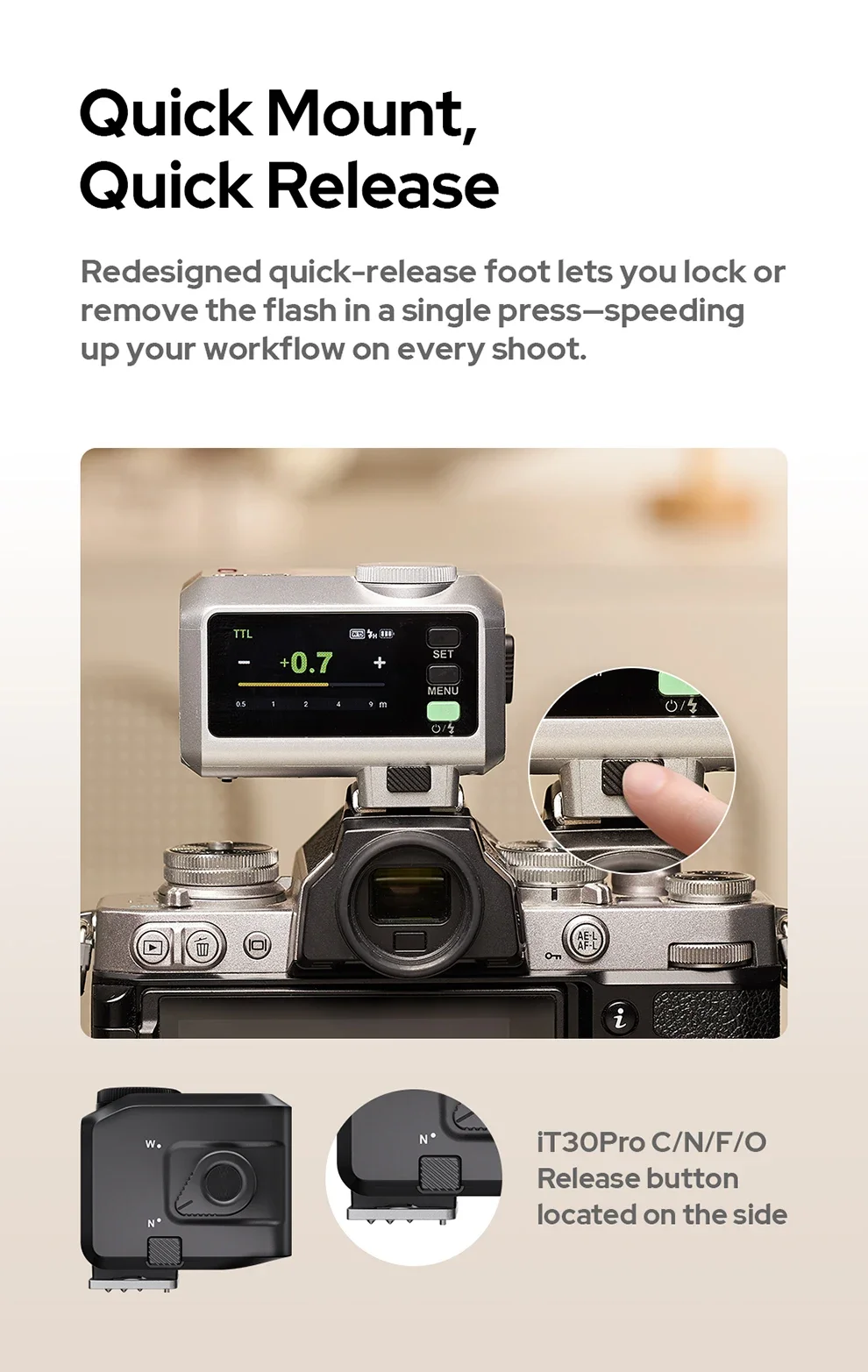 Sync Mode:High-speed sync (up to 1/8000 seconds, or 1/80000 seconds with Sony cameras