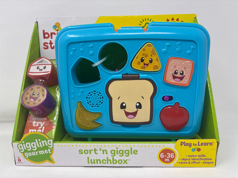 Let's play with our food! The Sort 'n Giggle Lunchbox from Bright Starts Giggling Gourmet Collection provides shape sorting fun and helps baby identify food names and colours. When baby places the food shapes into the correct slot, this little lunchbox announces the name of the food item or shape.Two light-up fruit buttons help teach colours, and entertain baby with silly sounds and melodies. Flip open the sandwich for more food identification fun with opposites. The handle is easy for little hands to grasp - this little lunchbox is perfect for take-out, and take along fun!