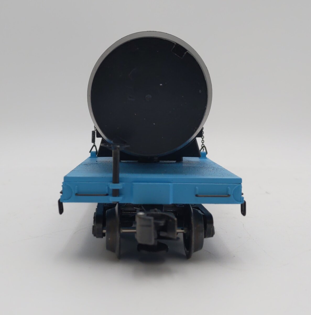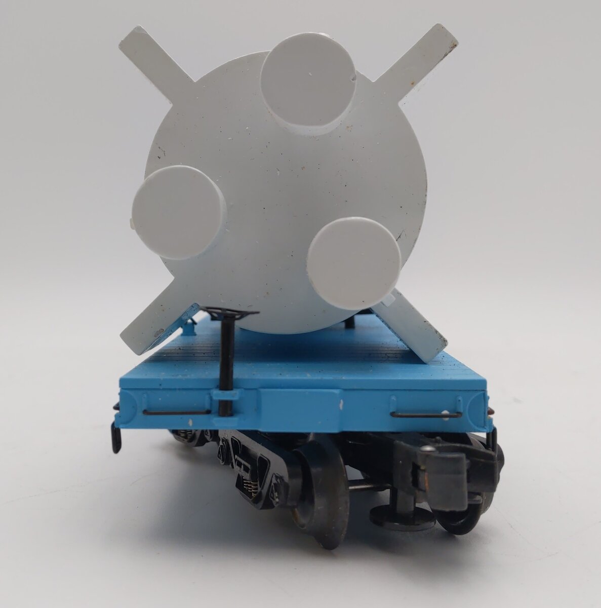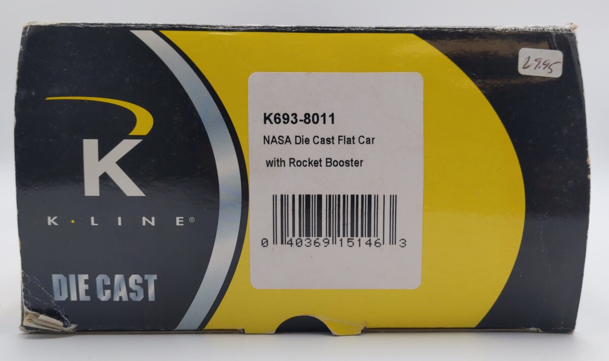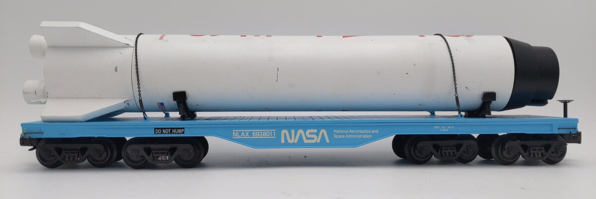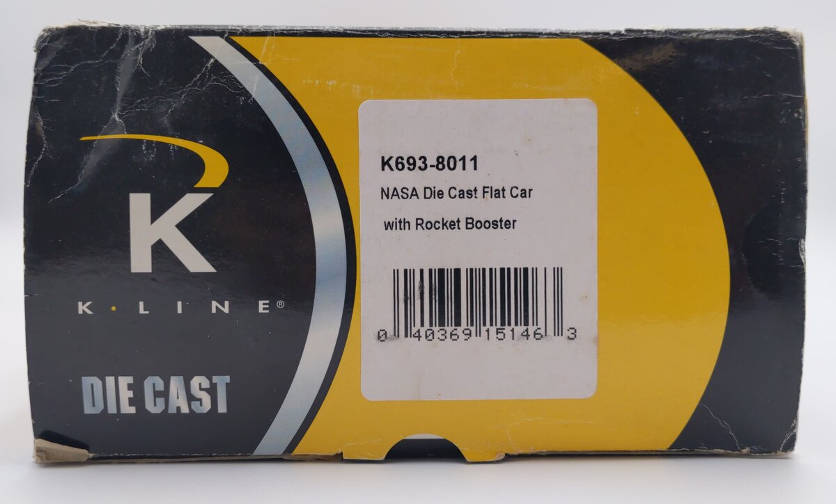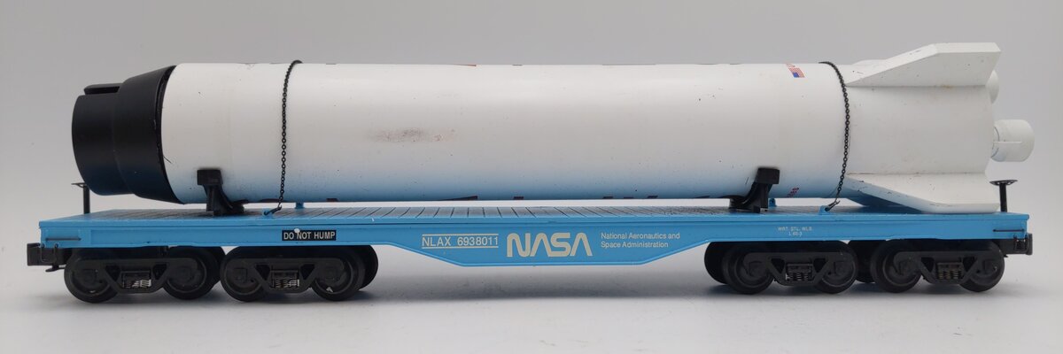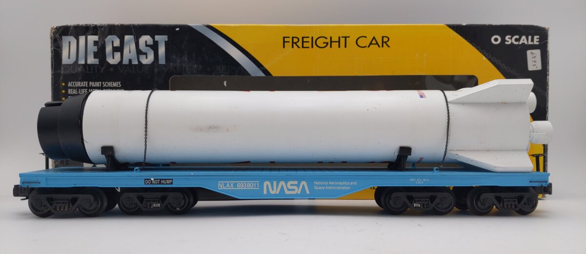 Here is a K-Line K693-8011 NASA Flatcar with Rocket Booster Load. It features fully sprung die-cast trucks and operating metal couplers. It is approximately 14 inches long and weighs over 2 pounds.