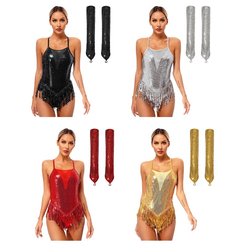 The top and shorts with shiny letter prints and sequin applique create an eye-catching effect.