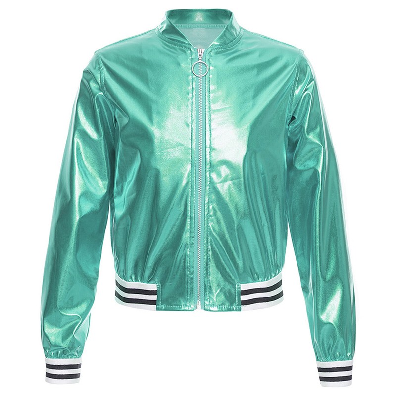 Long sleeve stand collar jacket with zipper closure at front, elastic cuffs and hem.