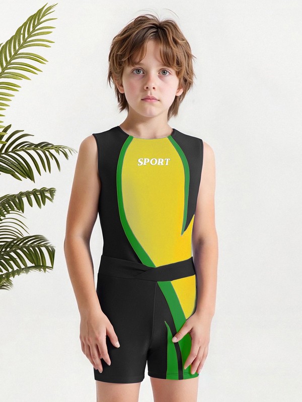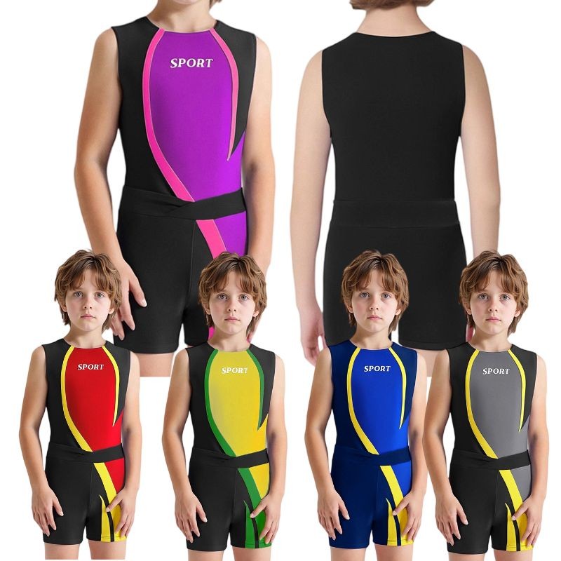 The round-neck sleeveless leotard with letter print and color-block design is trendy and eye-catching, following the latest fashion trends in kids’ sports wear.