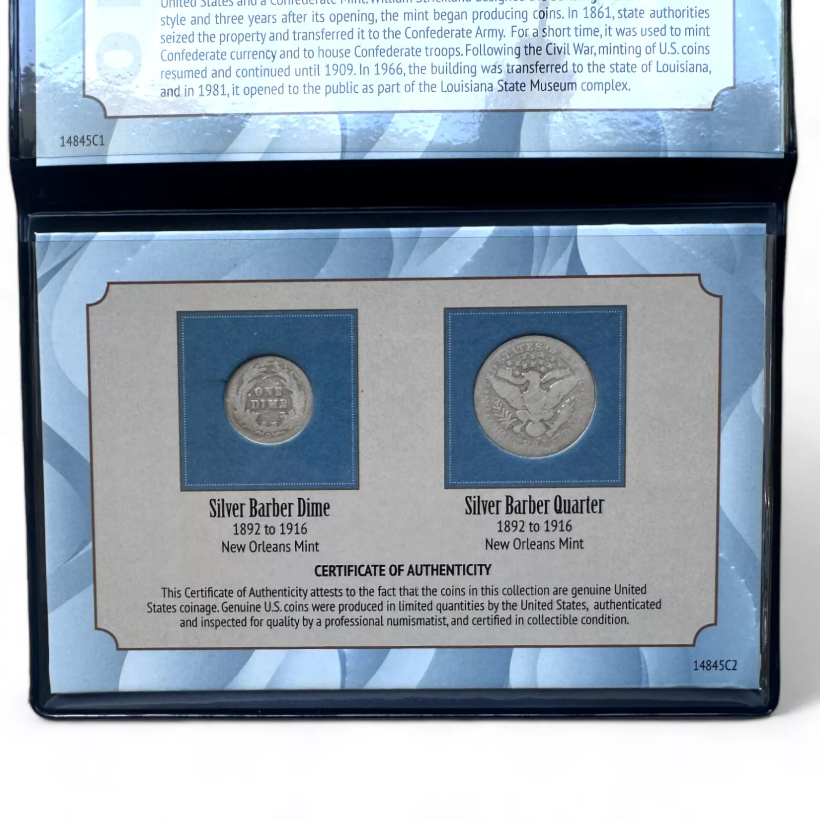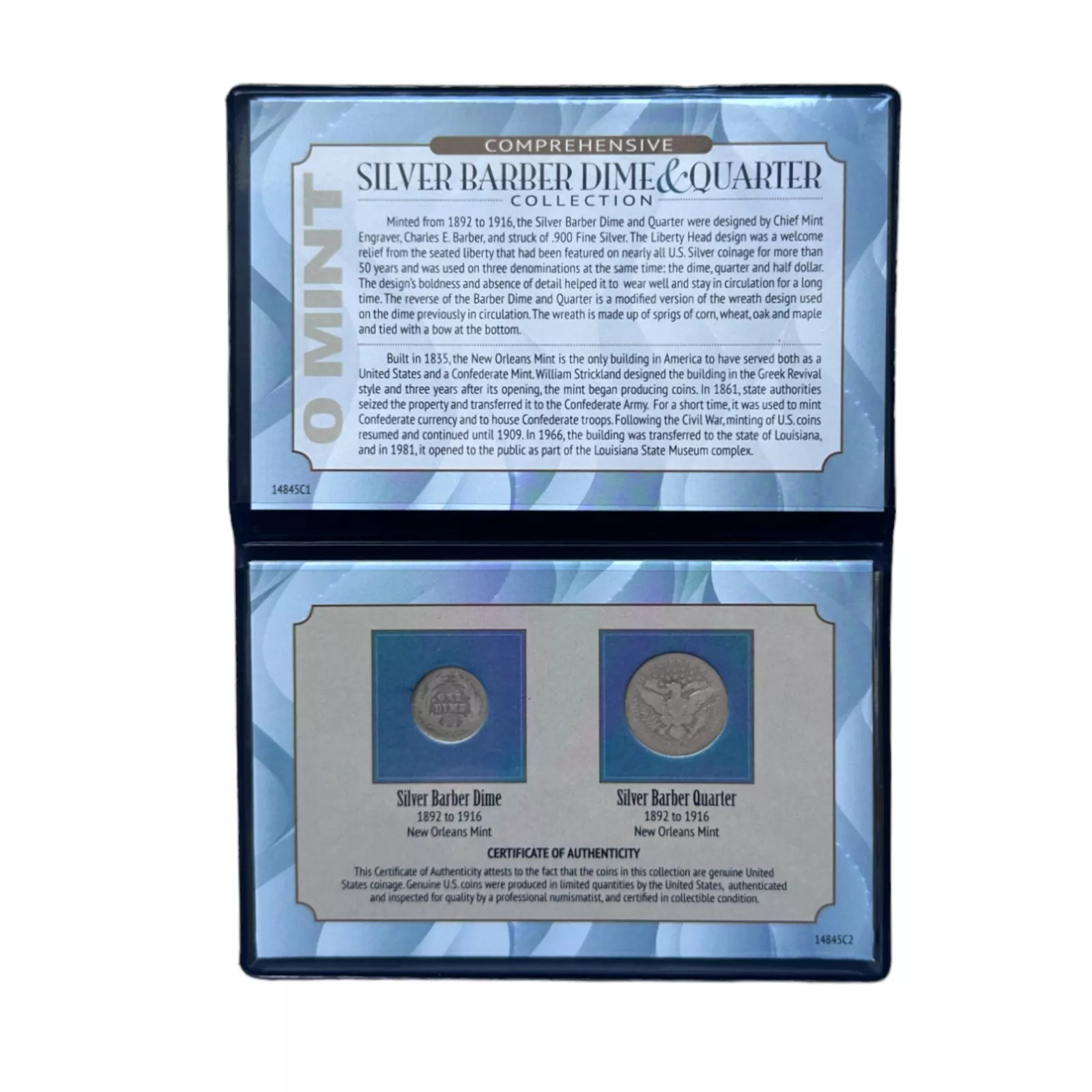 This two piece collection coin set includes two coins with an O Mint mark, minted at the New Orleans Mint. Minted from 1892 to 1916, the Silver Barber Dime and Quarter were designed by Chief Mint Engraver, Charles E. Barber, and struck of .900 Fine Silver. The design's boldness and absence of detail helped it to wear well and stay in circulation for a long time. The reverse of the Barber Dime and Quarter is a modified version of the wreath designed used on the dime previously in circulation. Both coins were struck at the New Orleans's Mint, which was built in 1835 and the only U.S. Mint to serve both as the United States and Confederate Mint. This collectible set comes in a vinyl folio with an informative insert and certificate of authenticity.