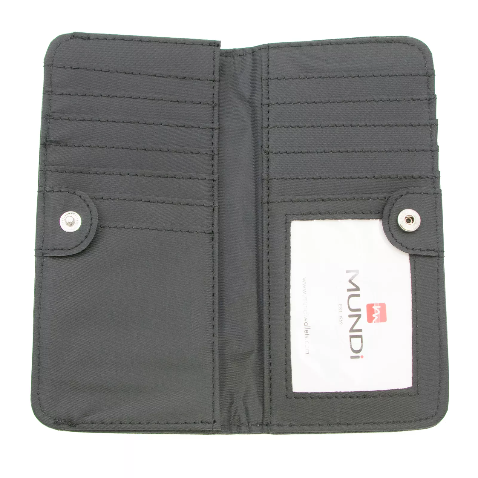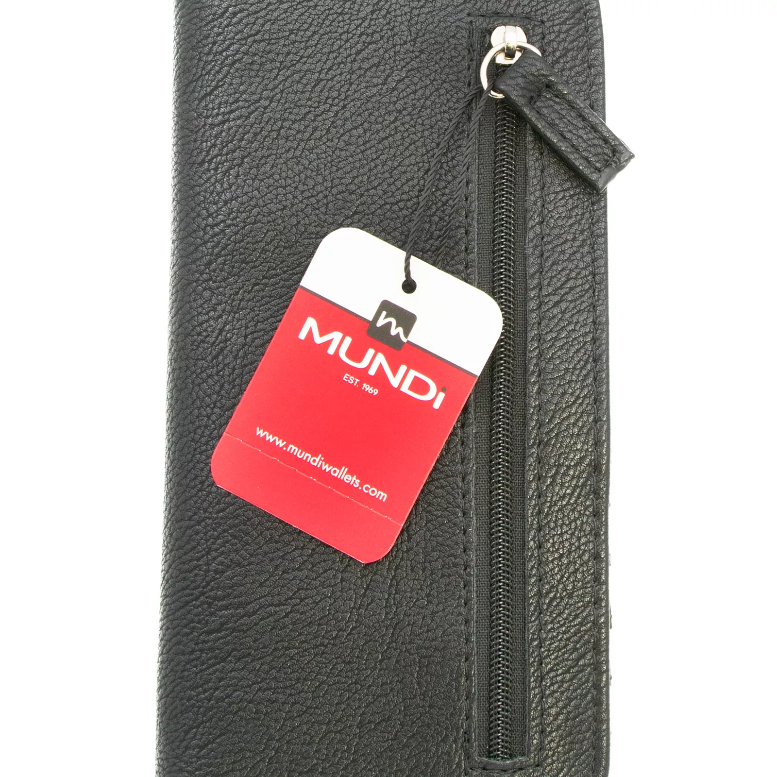 The Mundi slim size wallet is perfect to fit in your hands or handbags. It's functional and practical with a sleek design. There's plenty of storage and organization packed into this slim wallet with 11 credit card slots, 1 ID Window, 1 bill slip pocket, and one outside zippered pocket for coins. Everything secures shut with a snap closure. Keep your credit cards, debit cards and drivers licenses protected with SAFEKEEPER, a built-in security lining saves your information from theft. Made of Polyurethane. Dimensions: 7" L x 3 1/4" H x .5" D