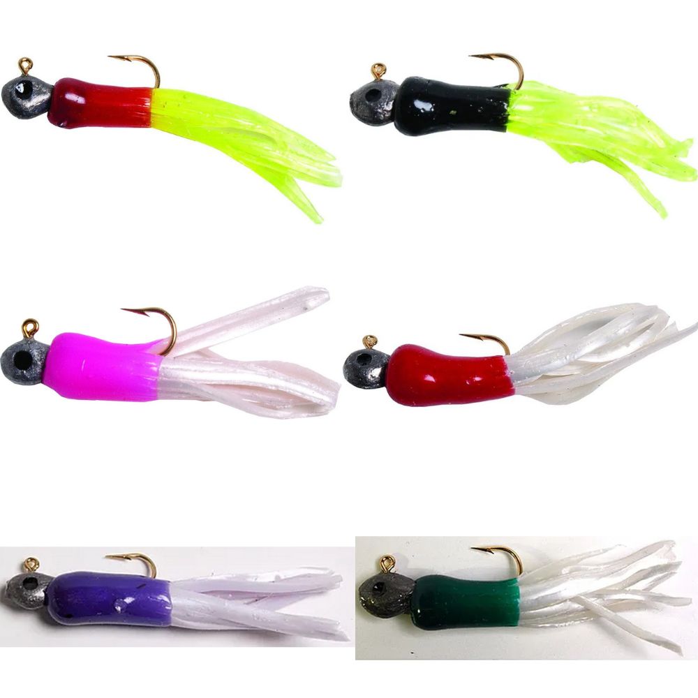 These Mini Tube Jigs are excellent for fishing for crappie, trout, bass, bluegill, perch and many other panfish. Tails are soft but tough. Loaded with action with a gold wire hook. Sharp barb on lead head holds tail on.
