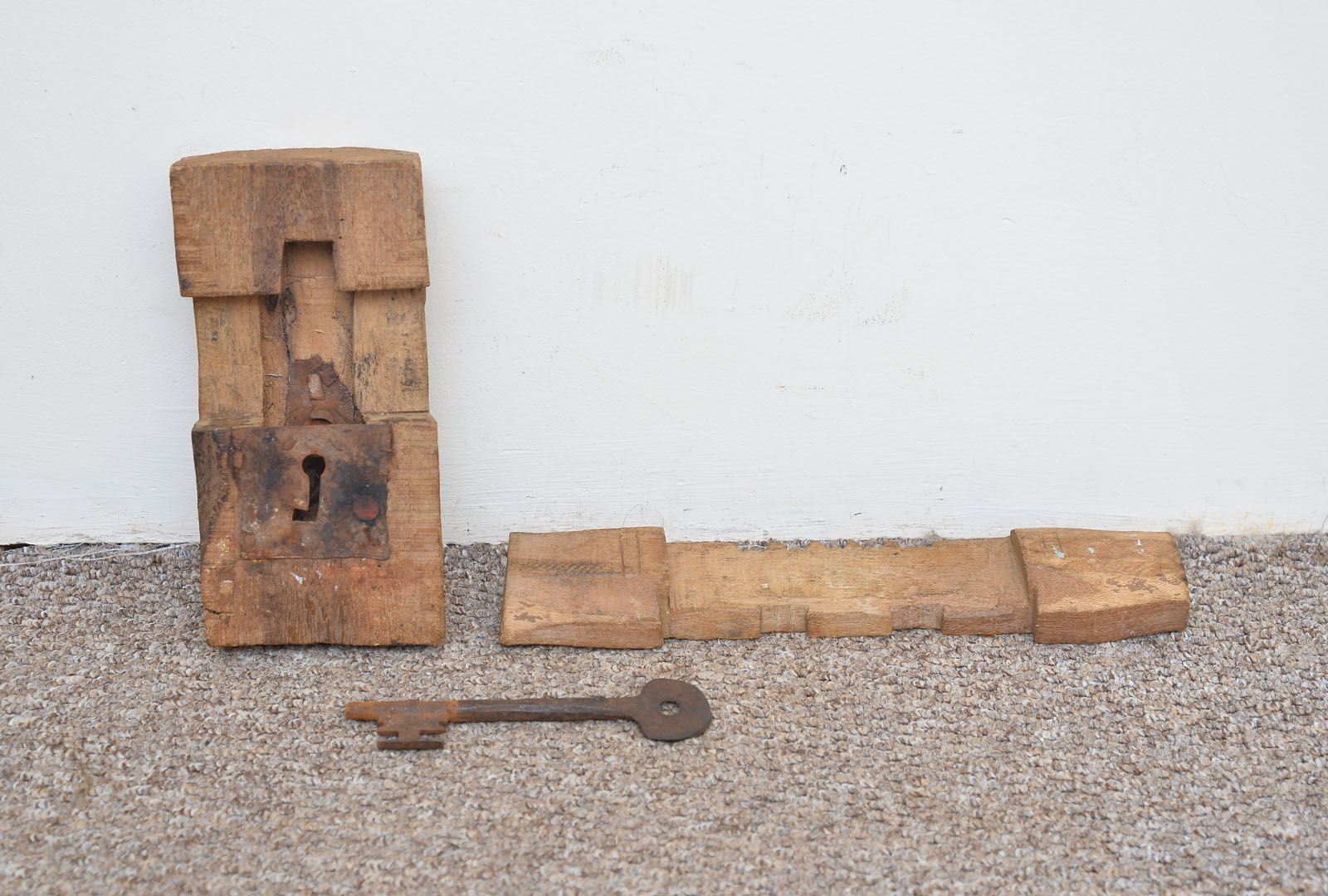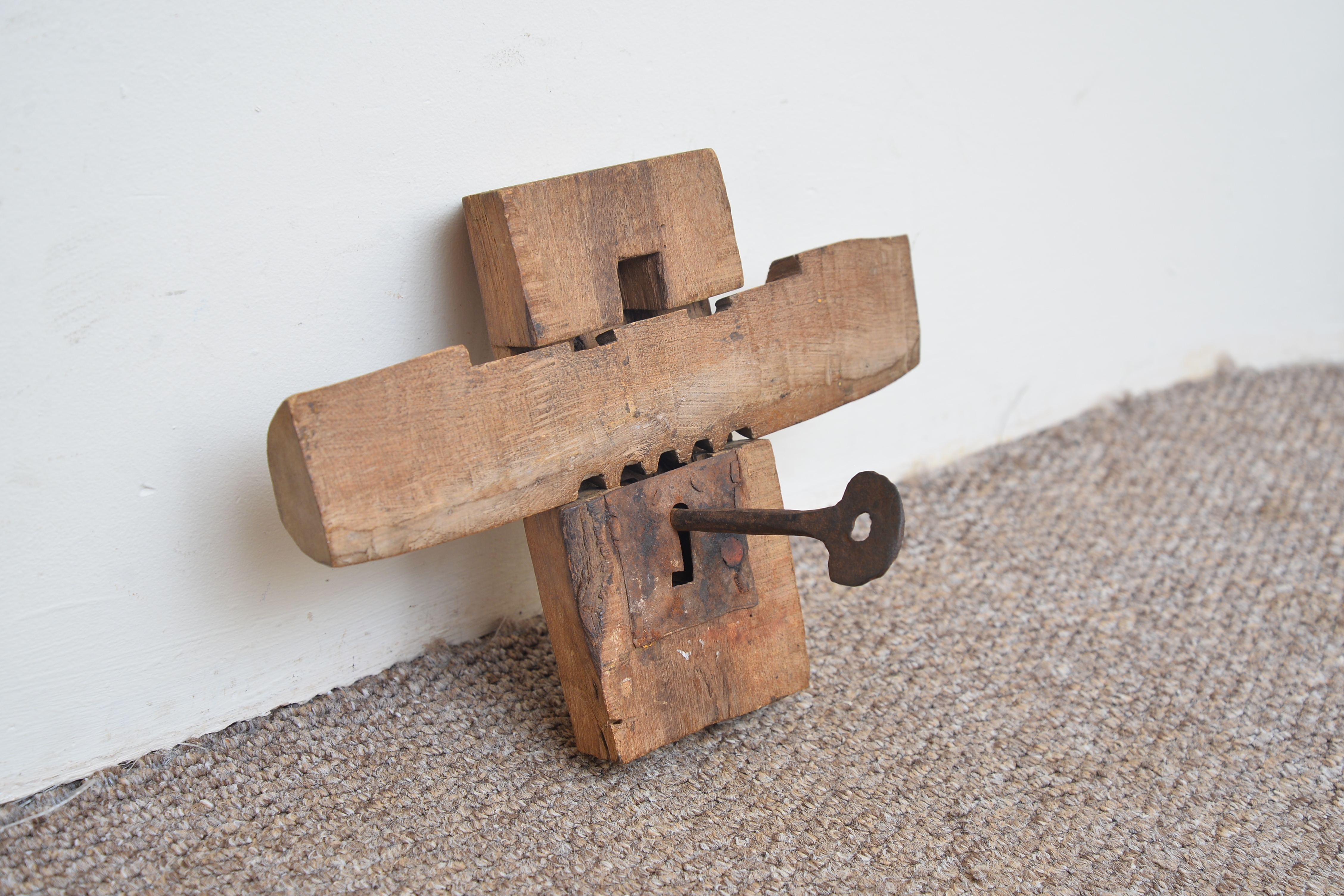 The body of the lock is of wood as is the sliding lock latch.