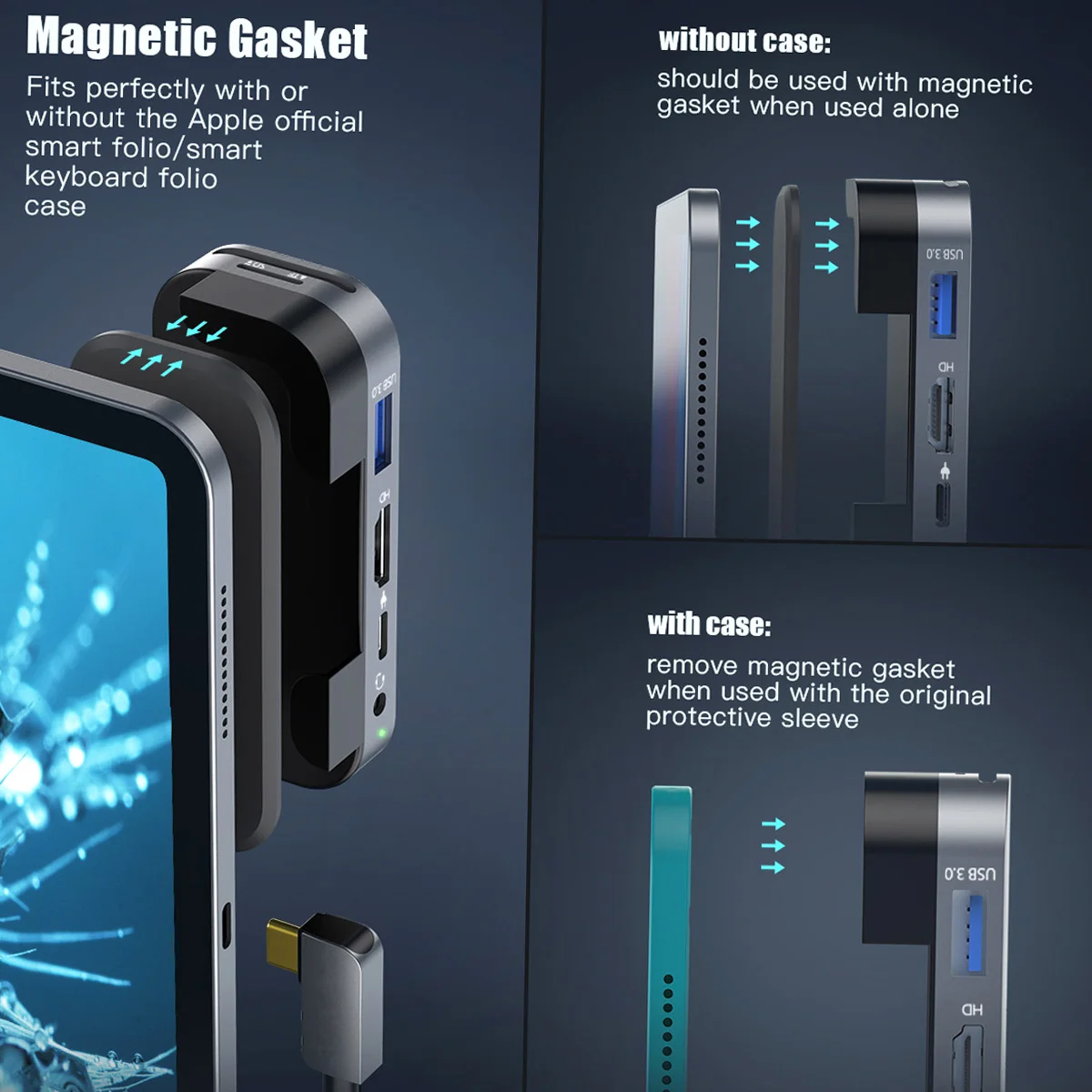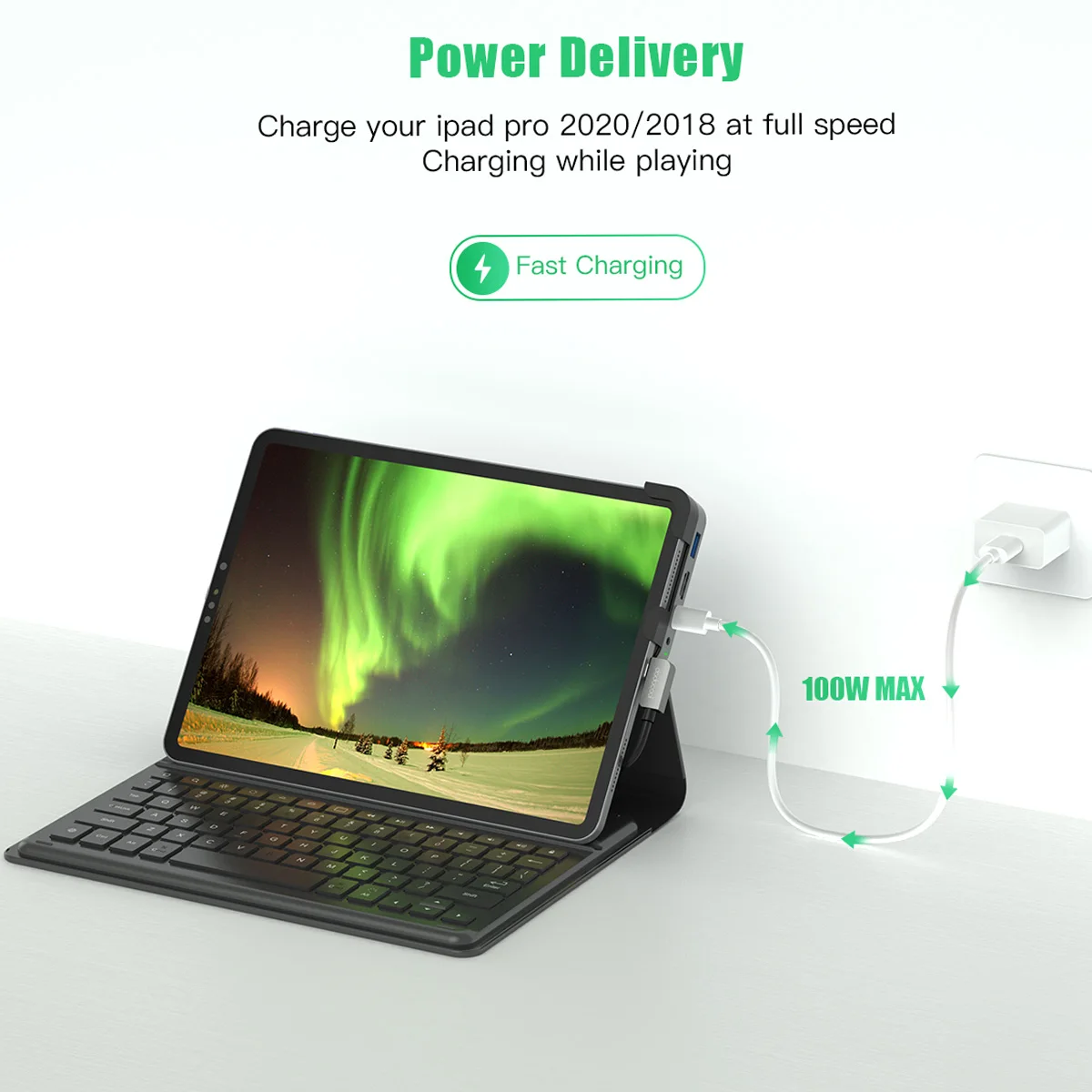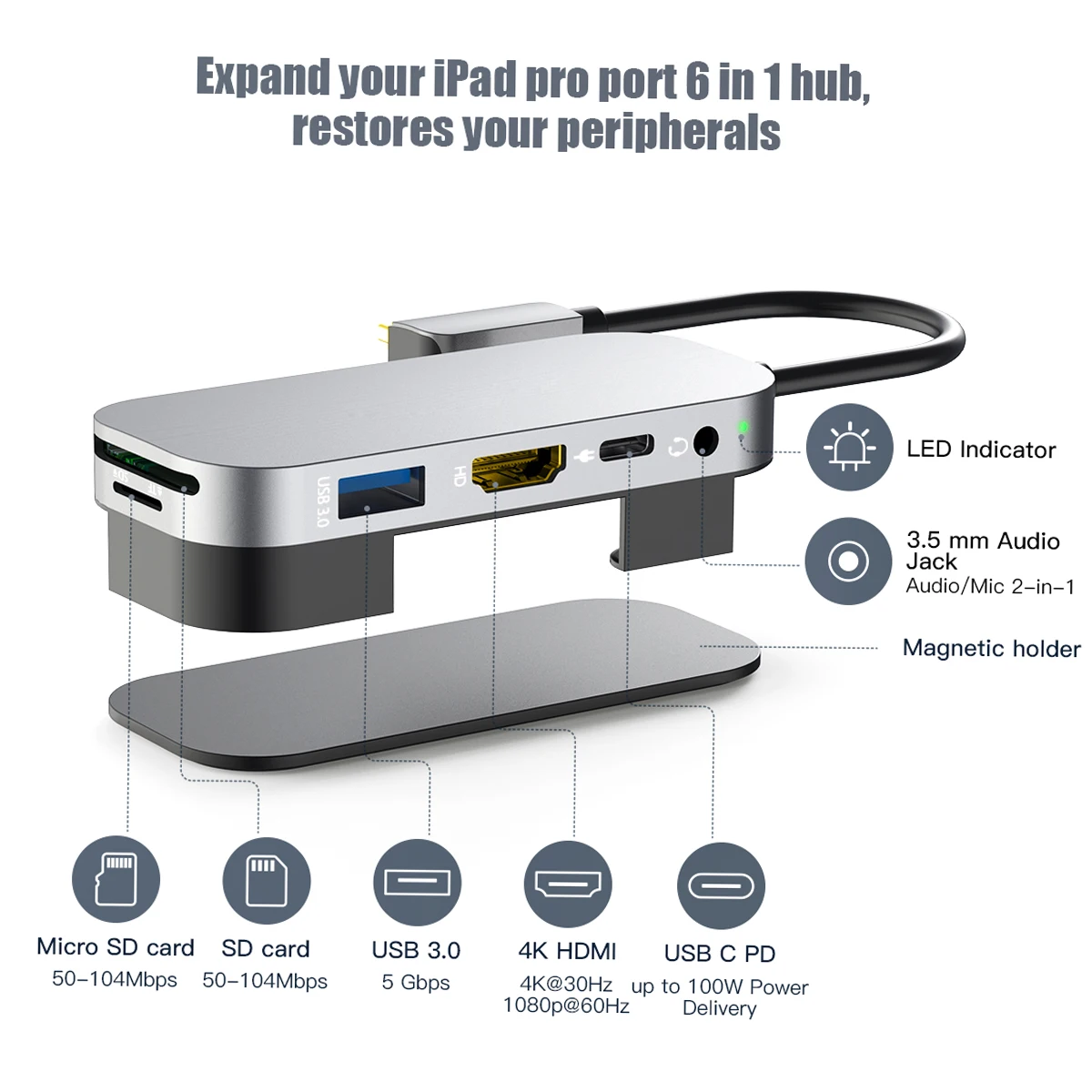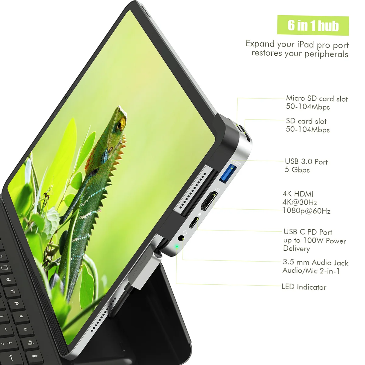 Designed for 2018 2020 iPad Pro 11/12.9 with USB C port, quick expansion for your iPad Pro with 3.5mm Audio Jack, USB-A Port, 4K HDMl Port, 100W Type-C Charging Port, SD/TF Card Slot. Plug and play, no driver/software is needed .Can be used with Smart Keyboard Folio and iPad case.