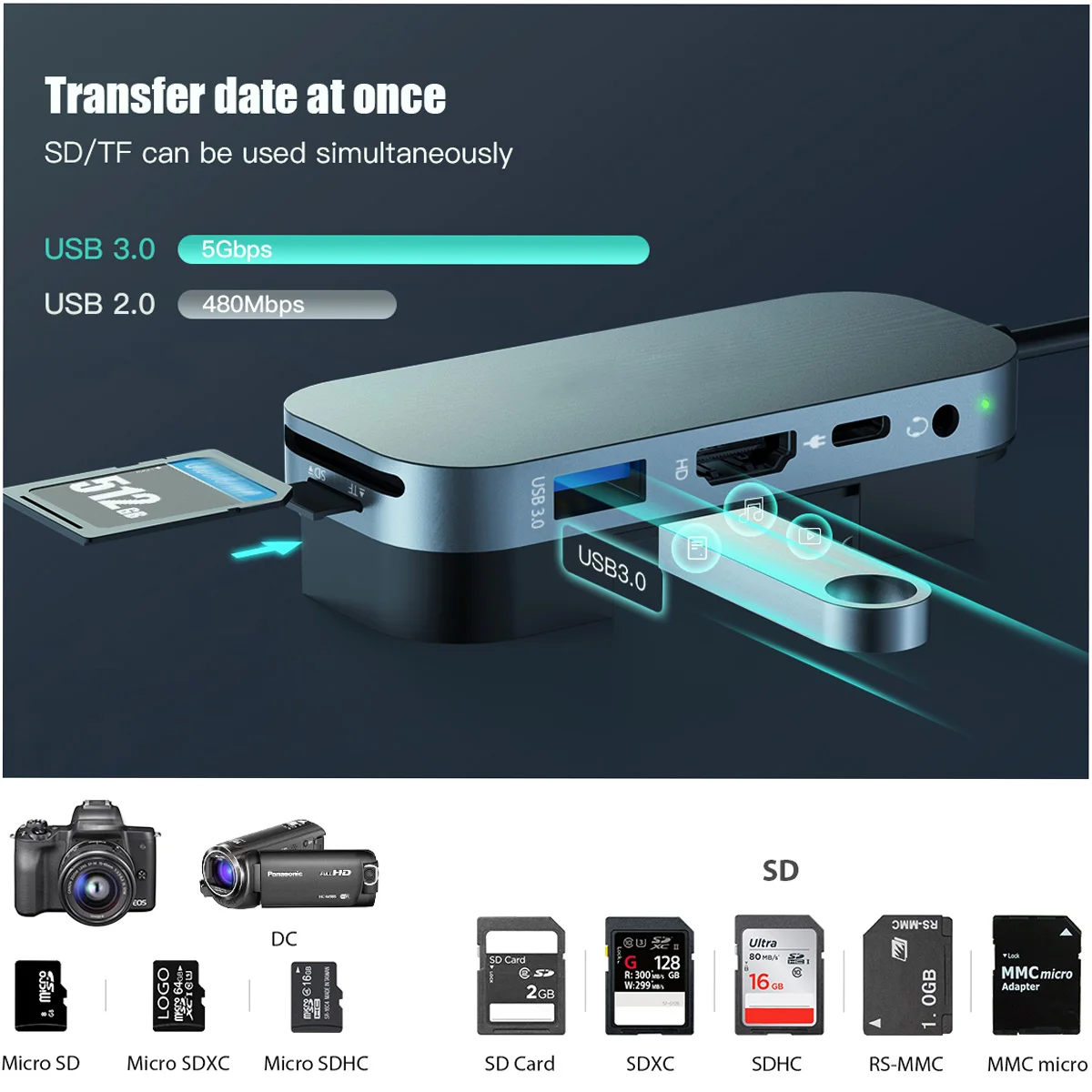 SD and TF card readers support up to 512GB. Sharing photos and videos with your families and friends.