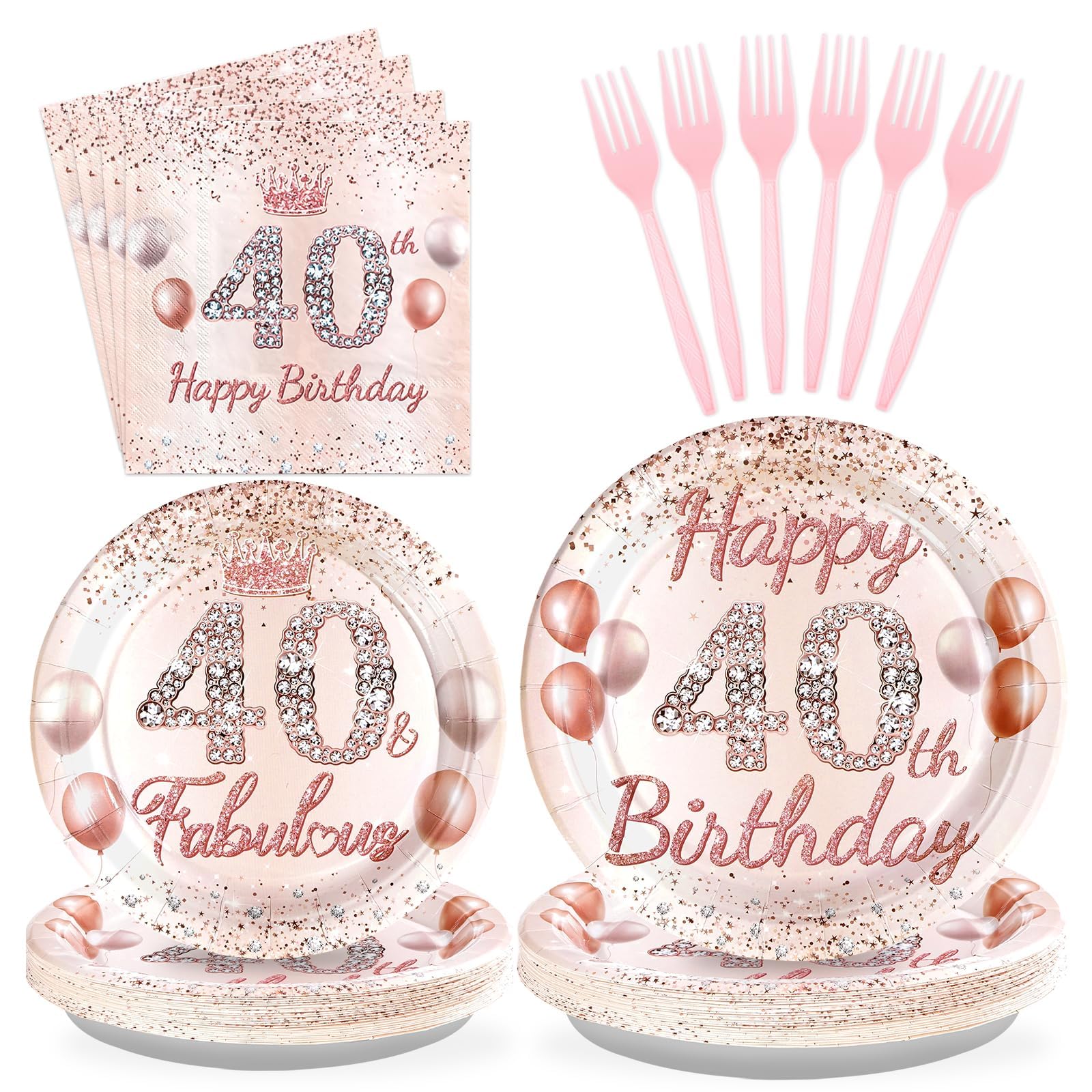 96 Pcs 40th Birthday Party Supplies for Women Rose Gold 40 Years Old Paper Plates and Napkins Tableware Set 40th Birthday Decorations for Ladies Women Forty Years Old Party Serves 24