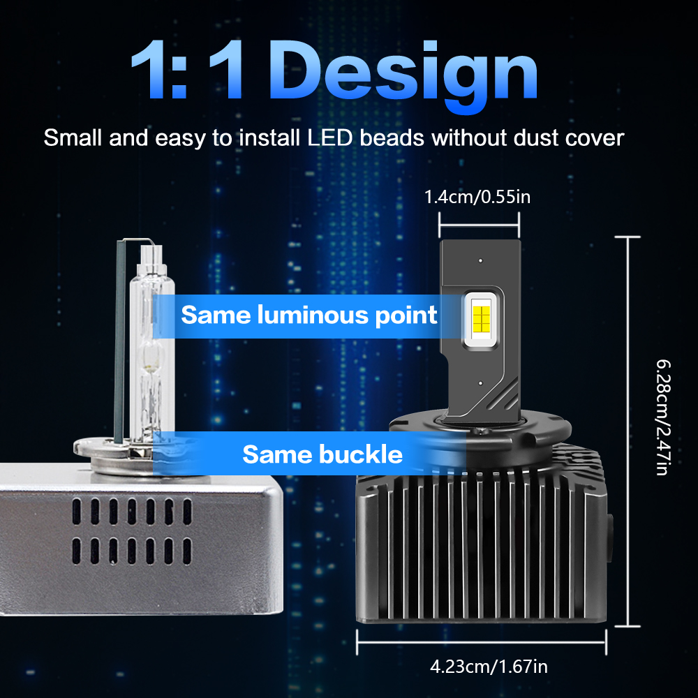 • Real plug-and-play: H11 plugs into factory socket; D5S/D5R is near 1:1 vs. OEM HID and interfaces with the original ballast—no bulky base or extra wiring.