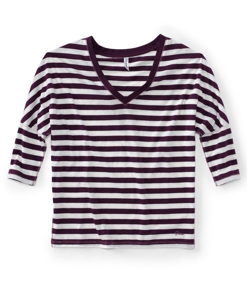 STRIPE DESIGN: Adorned with a classic striped print, the Aeropostale Women's V-Neck Stripe 3/4 Sleeve Graphic T-Shirt adds a fresh and stylish look to your casual wardrobe.
