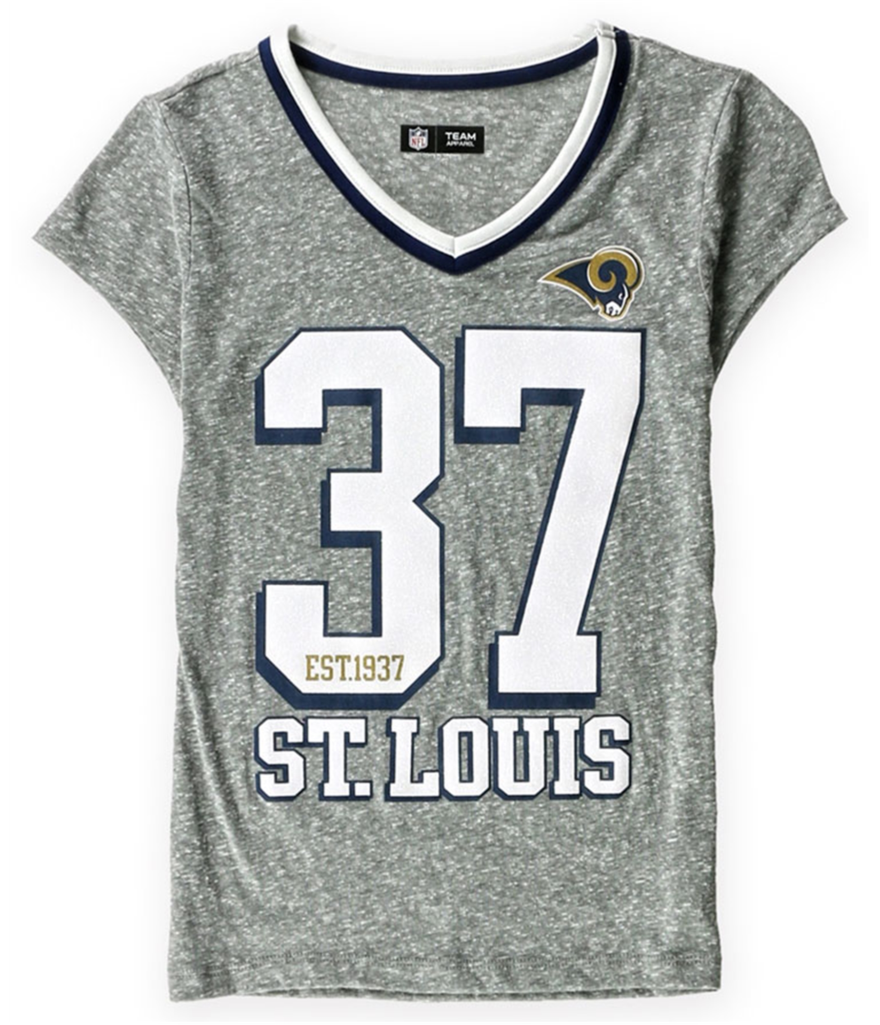 Style Number: 9442 Productline: NFL Team Apparel Gender: Girls Country of Manufacture: Vietnam Collar Style: Collarless Fit: Not Specified Material: 60% Cotton,40% Polyester Pattern: Graphic Print Season: All Seasons Density: Light Weight Sleeve Length: Short Sleeve Occasion: Athletic Theme: Sports Performance: Football League: NFL ThemeType: St. Louis Rams