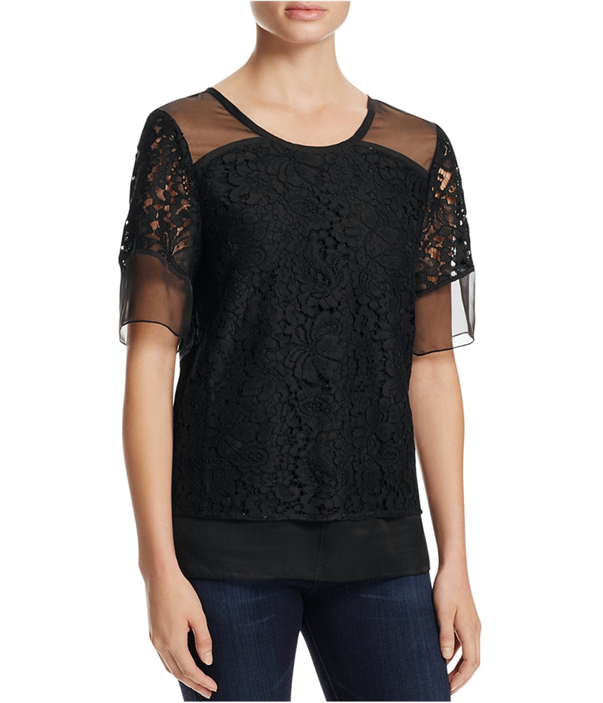 LACE ELEGANCE: The blouse is adorned with allover lace, enhanced by mesh insets at the shoulders, sleeves, and hem.