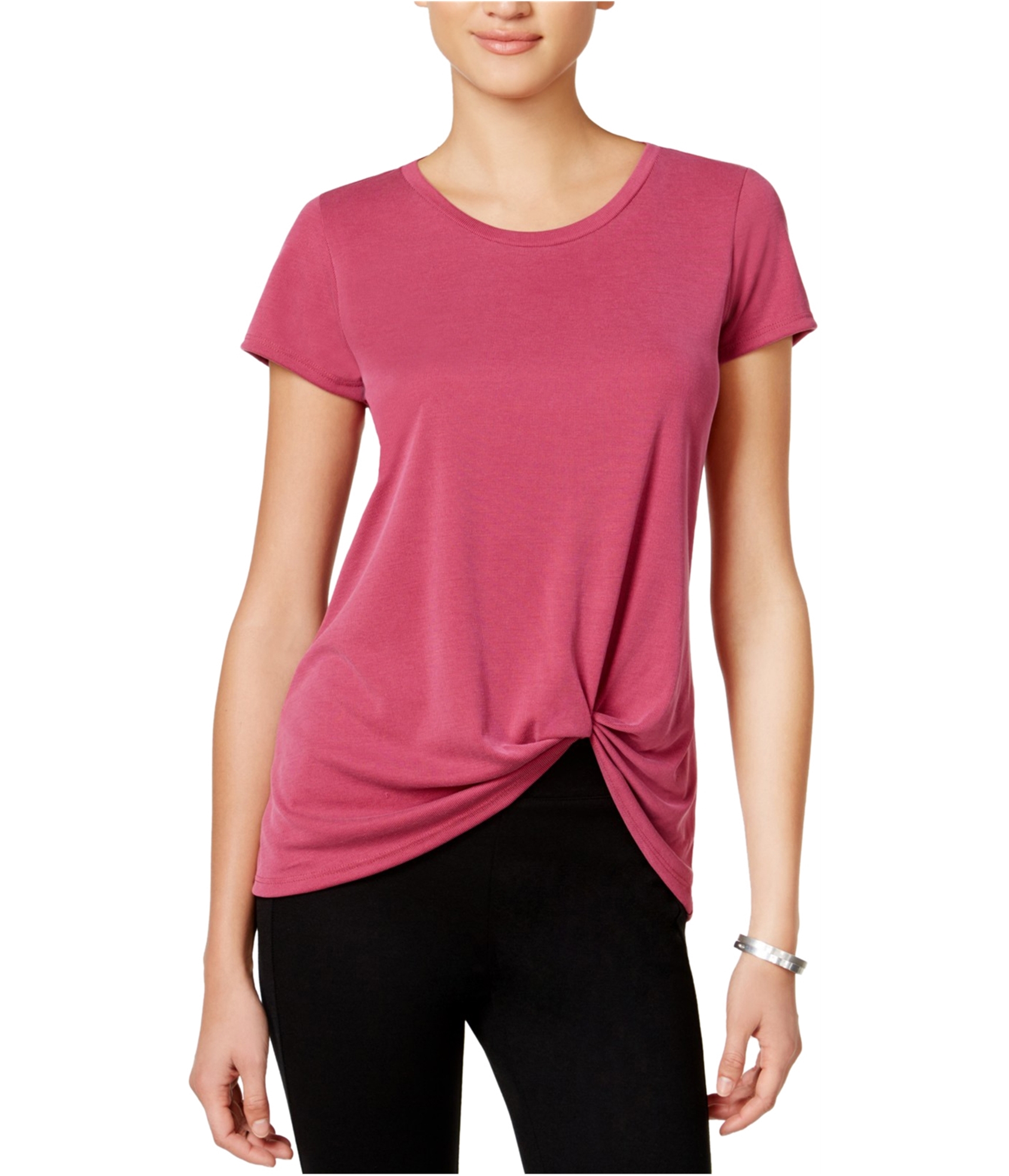Additional Details: Textured casual tee shirt Ribbed throughout Twisted knot detail on left side Short sleeeve Product Condition: ||This item is a customer return in new but defective condition, rated Good, with the following issues: Hole where knot should be.