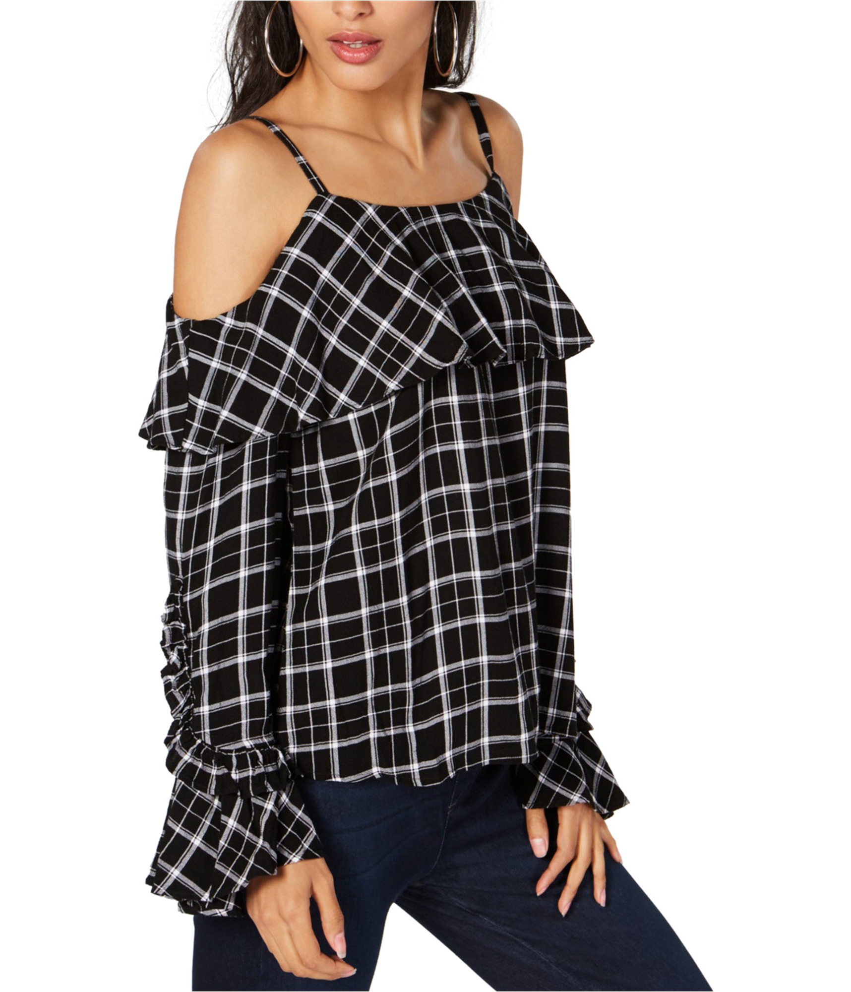 Dive deep into the world of chic with the I-N-C Womens Bell Sleeve Cold Shoulder Blouse. Crafted by the fashion mavens at International Concepts, this top is the epitome of modern flair. The enchanting plaid pattern is accentuated by ruffles that add a touch of whimsy, making you the darling of every gathering. And oh, those bell sleeves! They sway with an elegance that is hard to resist, while the cold shoulder design hints at a playful daringness, ensuring you never go unnoticed. Born in the heart of India, this blouse is more than just a piece of clothing; it's a statement. Its 100% rayon material promises unmatched comfort, while its opaque finish speaks of sophistication. Designed to accompany you through all seasons, its medium weight ensures you're cozy when it's chilly and breezy when the sun shines. Whether you're off to a casual meetup or an evening gala, this blouse ensures you're not just in the room, but you own it. With adjustable features, it molds to your style, making every moment an unforgettable fashion story.