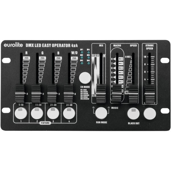 Die Bedienung erfolgt über fünf Fader: Vier davon sind jeweils einer Farbe (RGBW) zugeordnet, während ein weiterer Fader zur direkten Farbmischung dient. Eine regelbare Strobe-Funktion sowie eine praktische Blackout-Taste erlauben die punktgenaue Gestaltung von Lichteffekten – ideal für Übergänge, Showeinlagen oder dramatische Akzentuierungen.