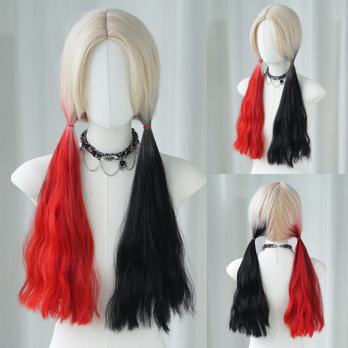 harley quinn wig, red black wig, cosplay wig, halloween wig, pigtails wig, costume wig, long curly wig, comic con wig, full head