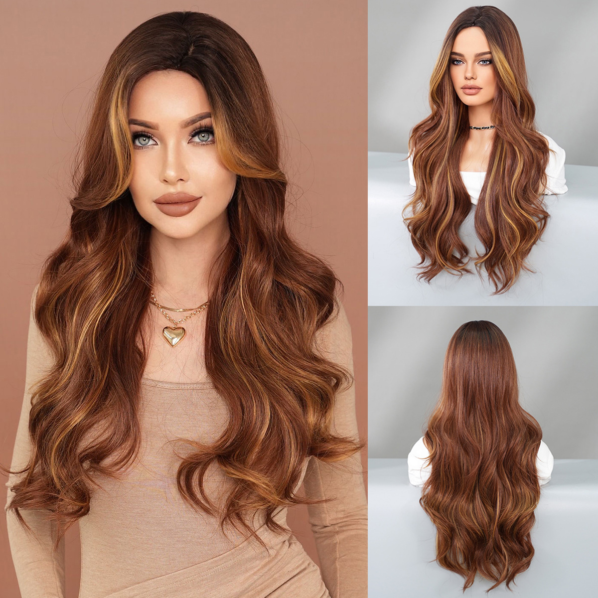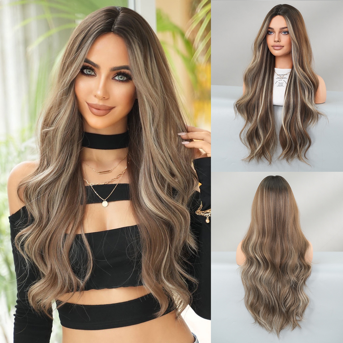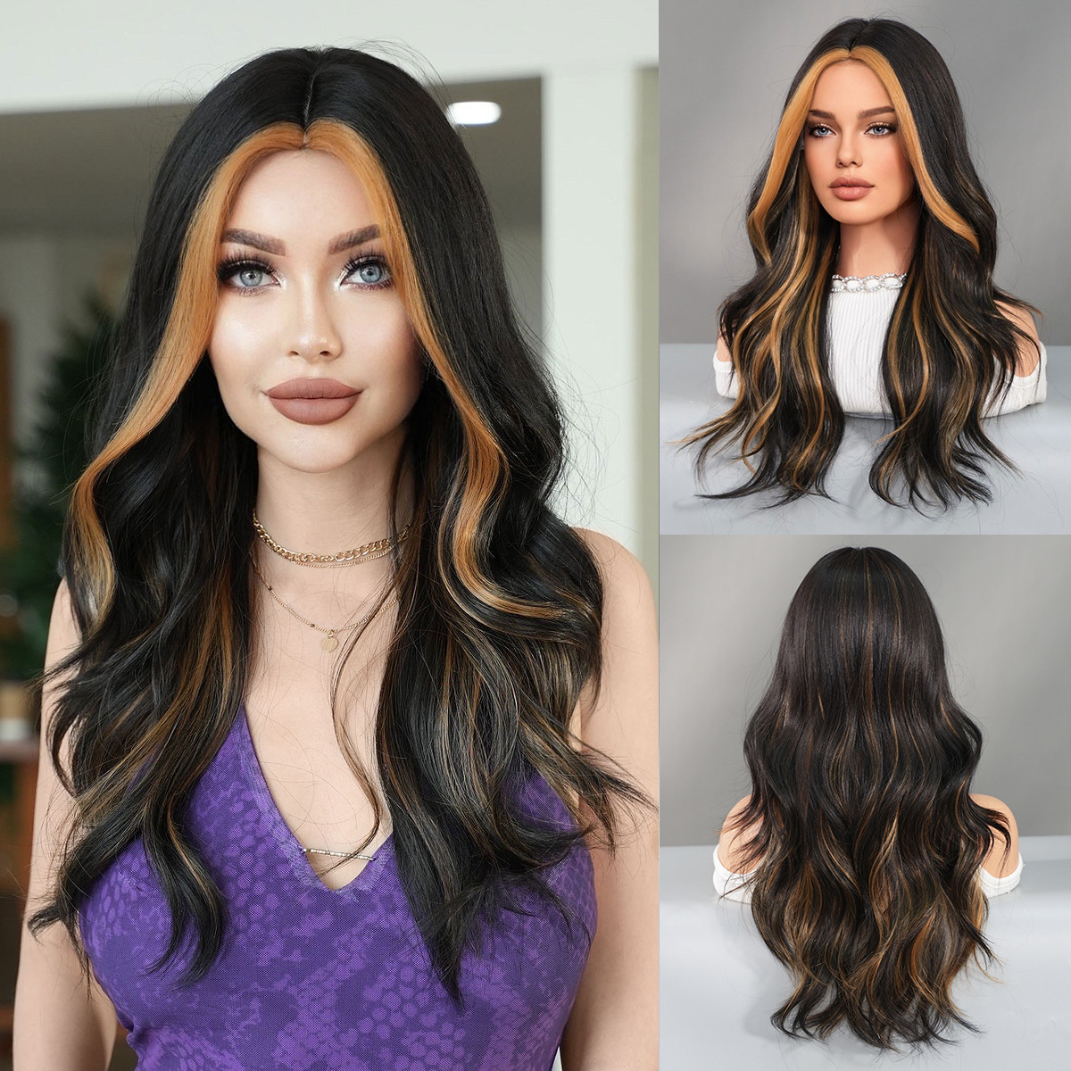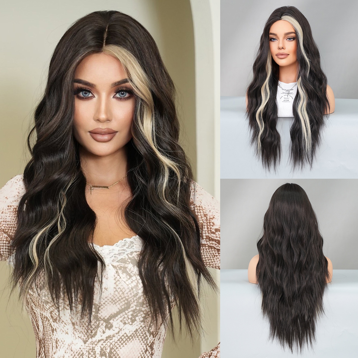 long wavy wig, middle part wig, highlight wig, synthetic wig, fashion wig, curly wig, full head wig, daily wear wig, cosplay wig