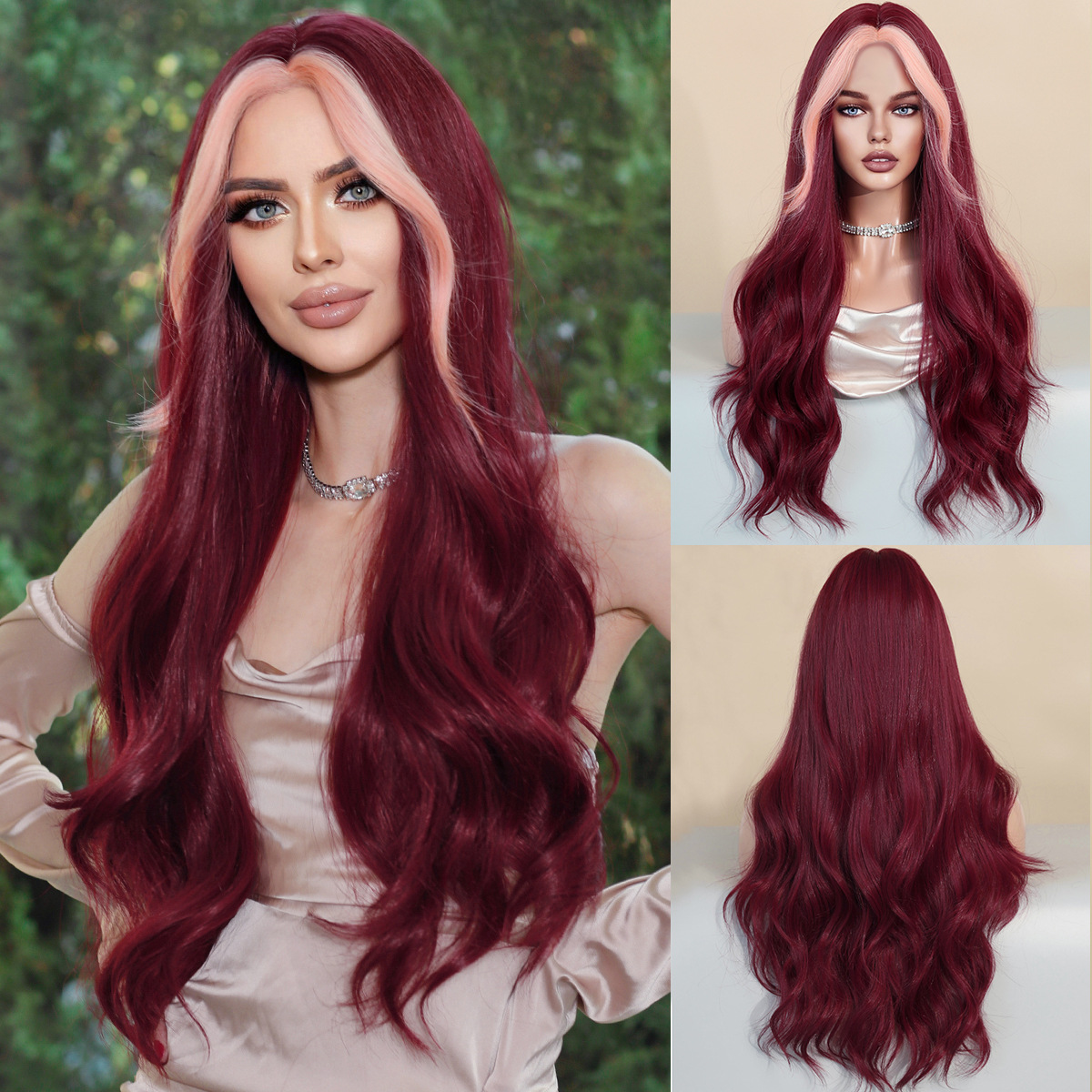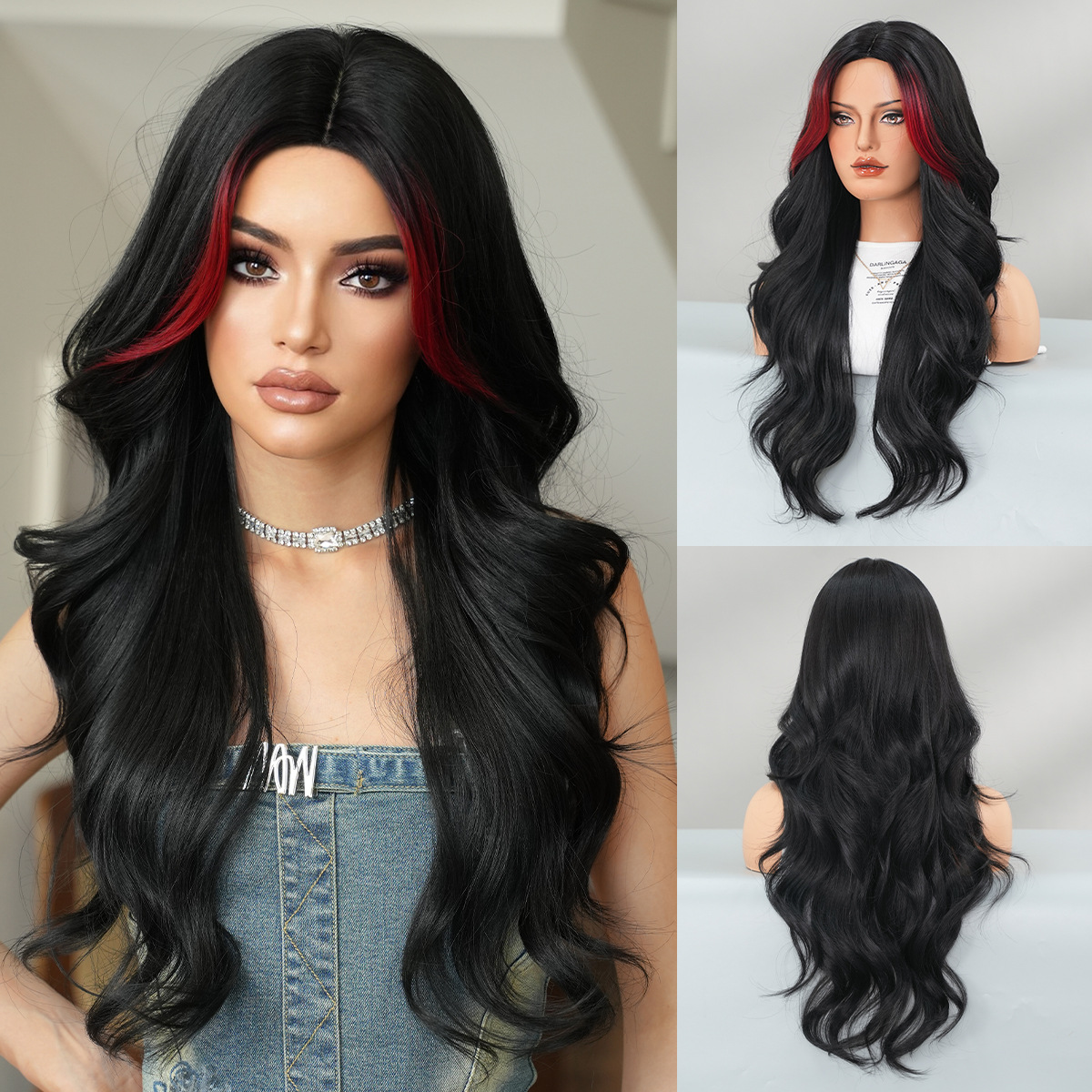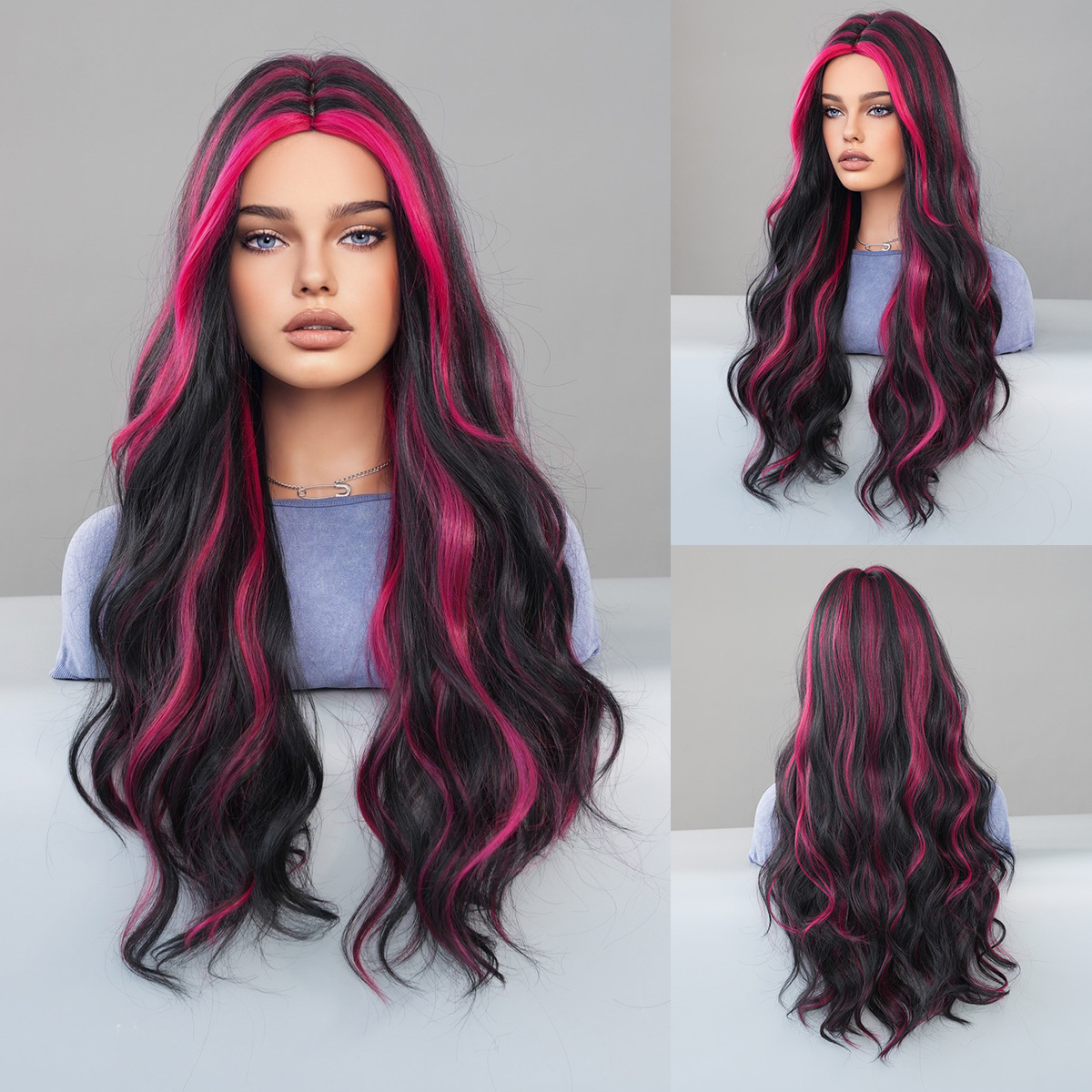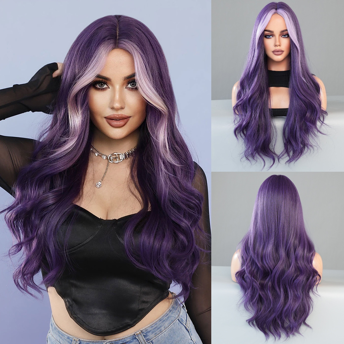 long wavy wig, middle part wig, highlight wig, synthetic wig, fashion wig, curly wig, full head wig, daily wear wig, cosplay wig
