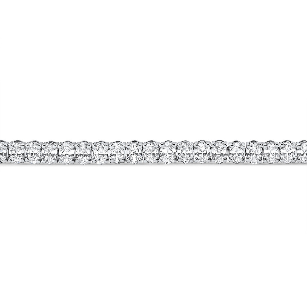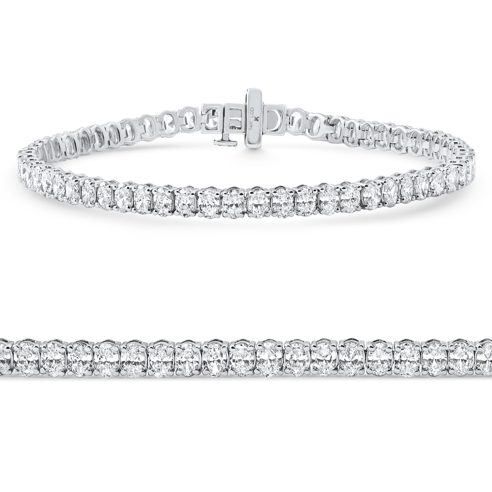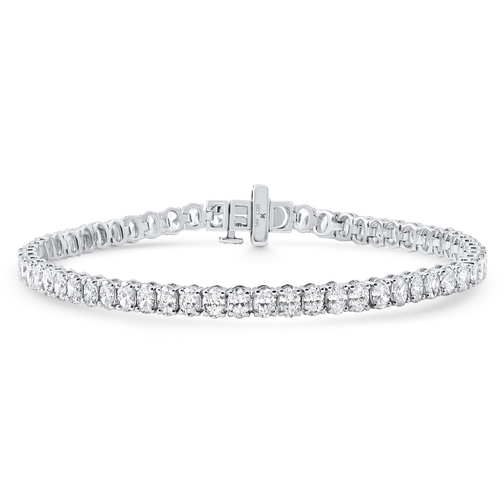 This classic women's bracelet features 60 oval cut lab grown diamonds. All diamonds are prong set in a 14k white gold mounting. The bracelet features a double lock for security and durability. The mounting has good flex and beautiful enough to wear every day.