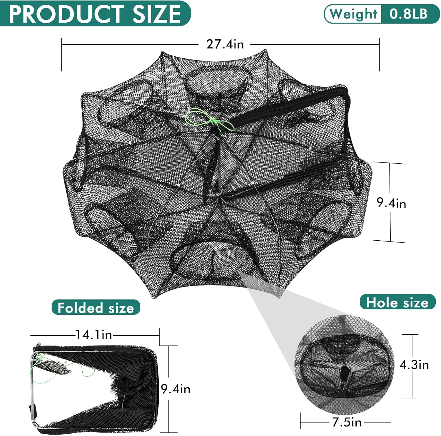 Multi-Sides Attract More: QualyQualy crab net have 10 sides large space 32in x 10in, 6/8/10 holes for choice, the 10 Hole entrance size 7.3in x 4in, and it's only 16in x 10in x 2in after folded it,easier to carry and store