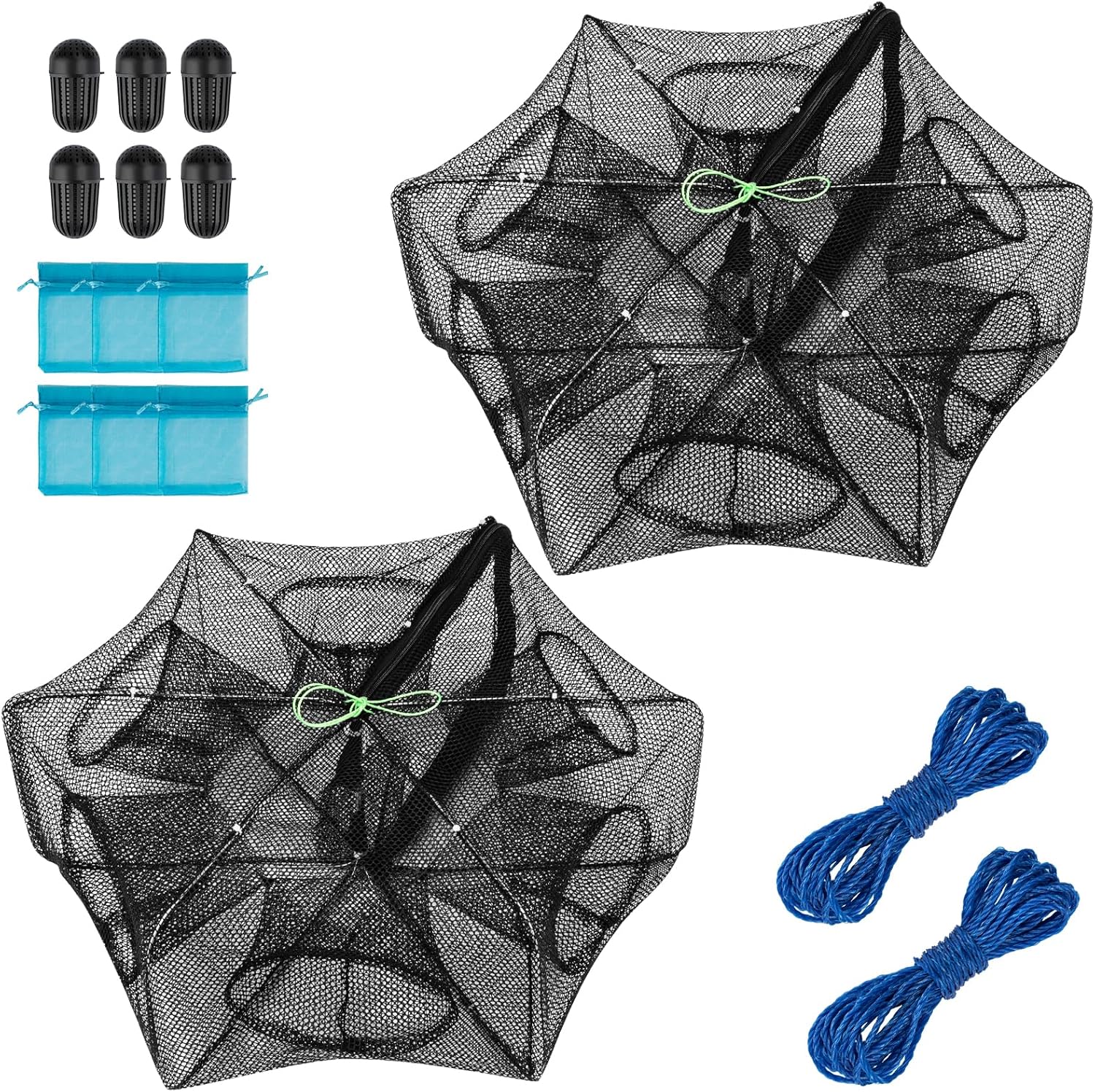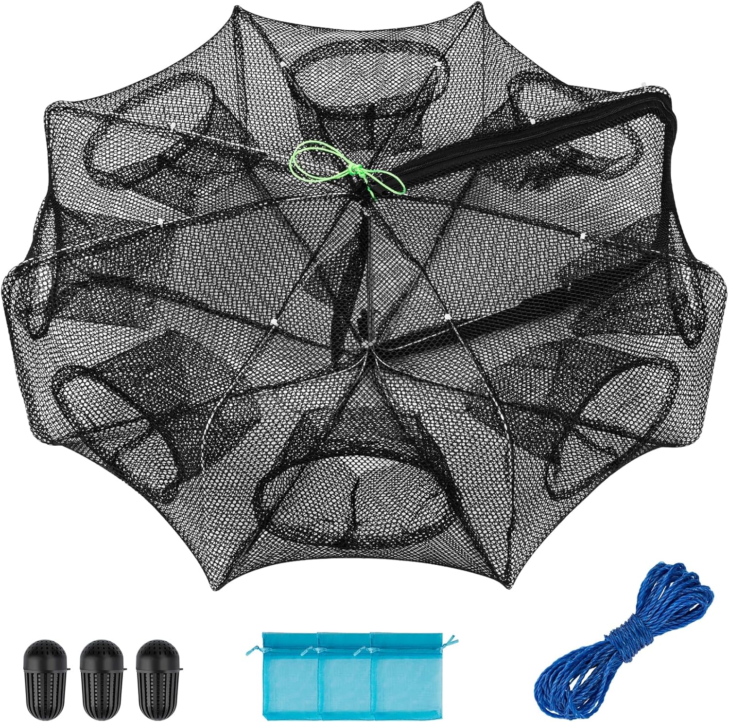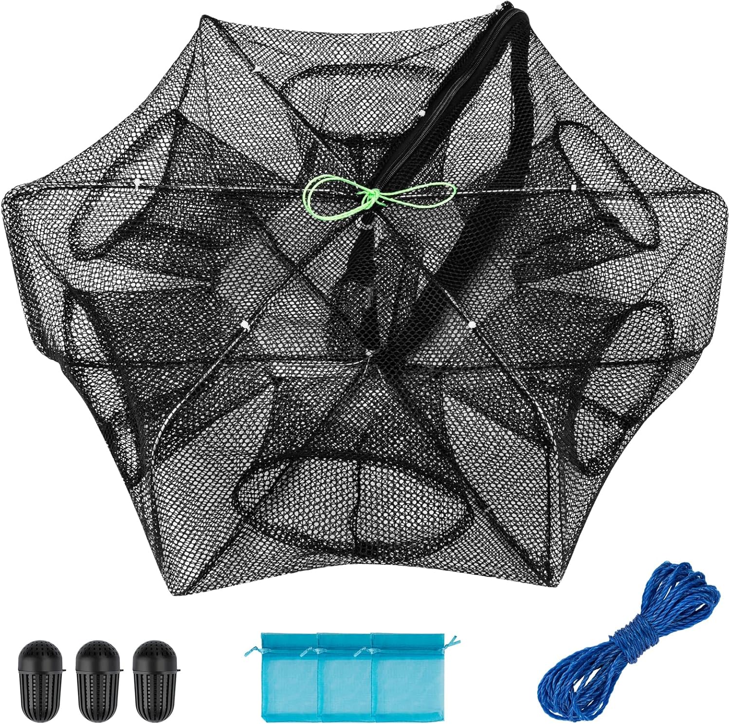 Package Include:Mesh size: 0.2inch/0.5CM,the fishing bait trap weight :0.65kg/1.4lb. The package includes crab trap * 1, 5m rope 1, bait net bag * 3, bait cages 3