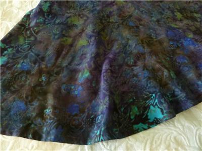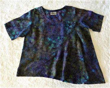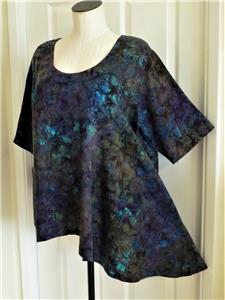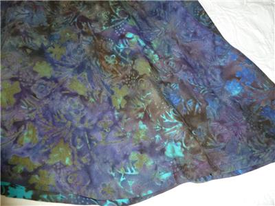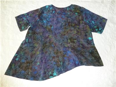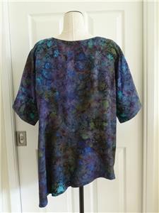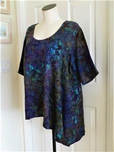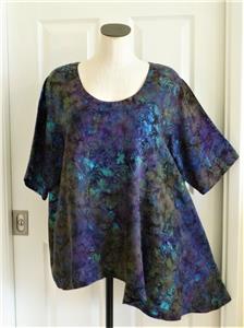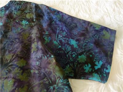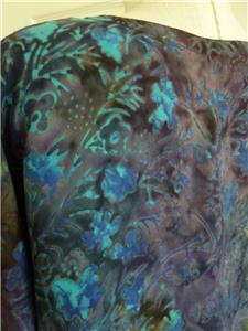 Stunning tunic top from Tienda Ho in their "Free Size", check measurements below. 100% rayon, soft and smooth with easy drape. The colors and mixed florals are just gorgeous, in purples, blues, aqua and sage. Generously designed A-line silhouette and elbow-length sleeves, scooped neck, pieced construction, with curved asymmetrical hem. Excellent condition. Best appreciated by reviewing all 14 photos.