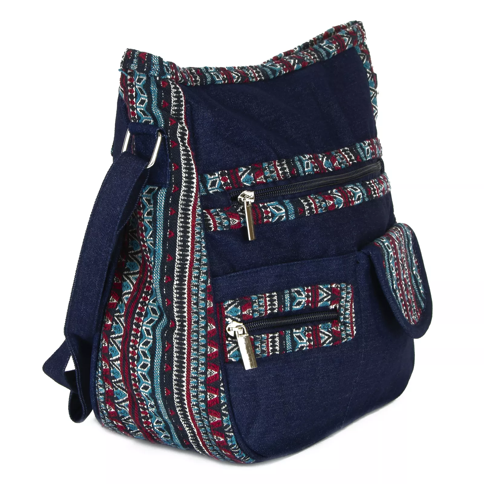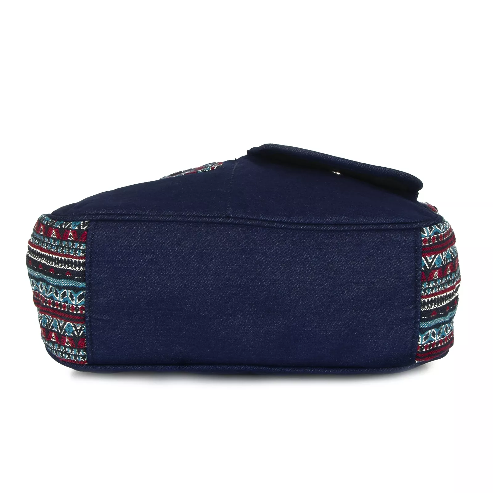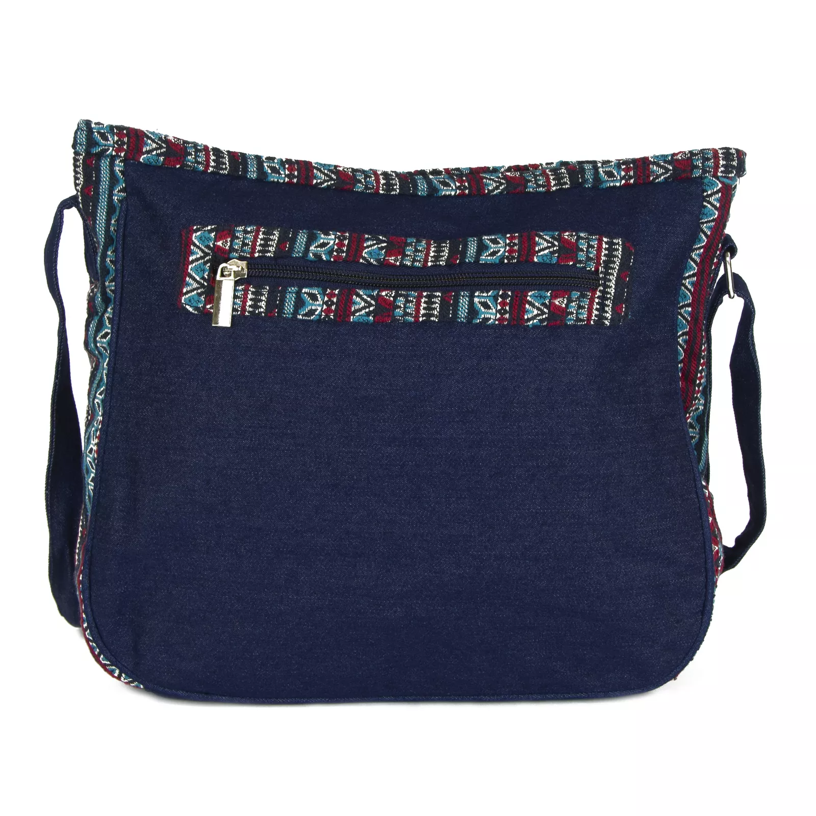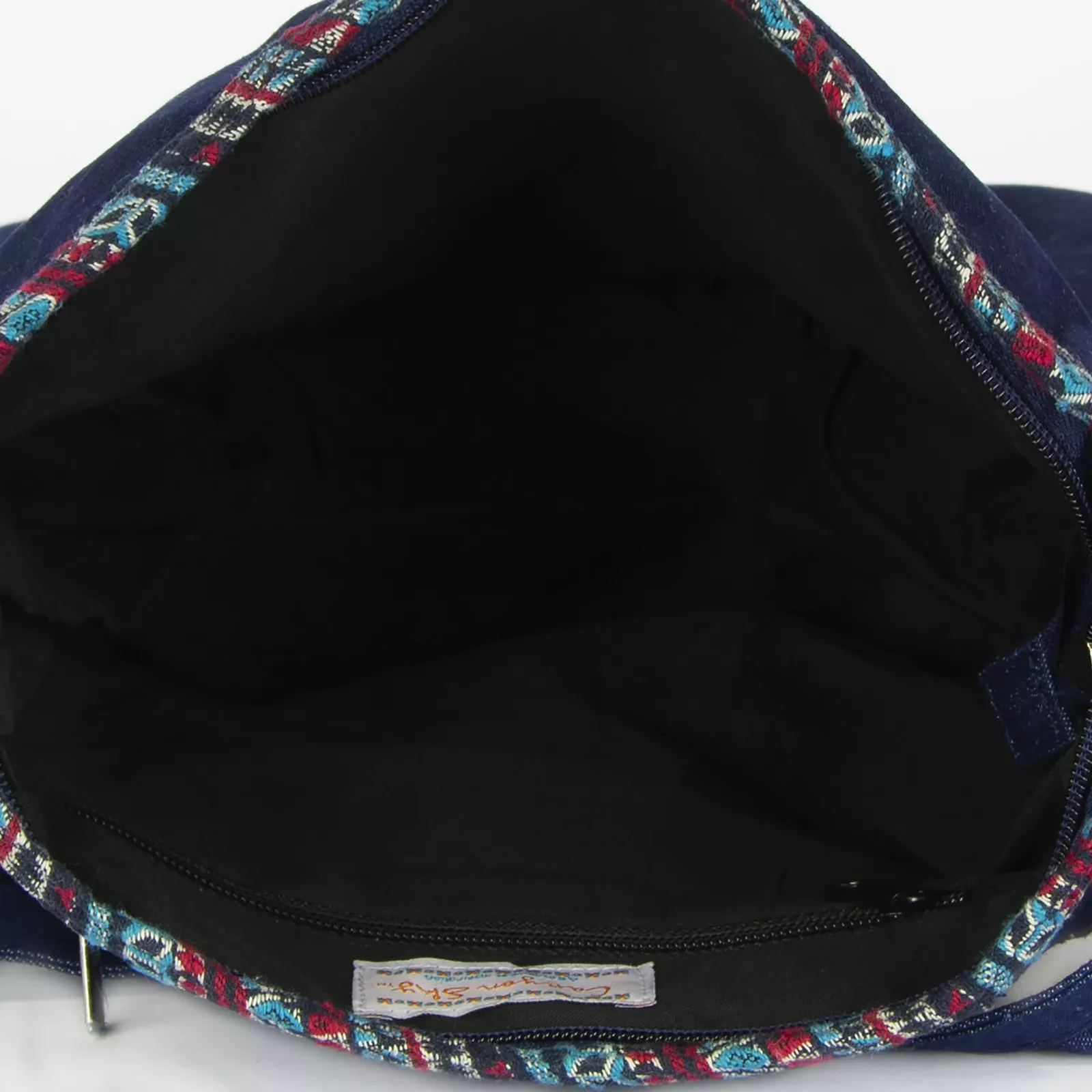 - SOUTHWESTERN DENIM DESIGN – Blue cotton denim handbag accented with tribal-inspired trim in blue, cream, and red for a stylish Western, bohemian, Aztec-inspired fashion statement.