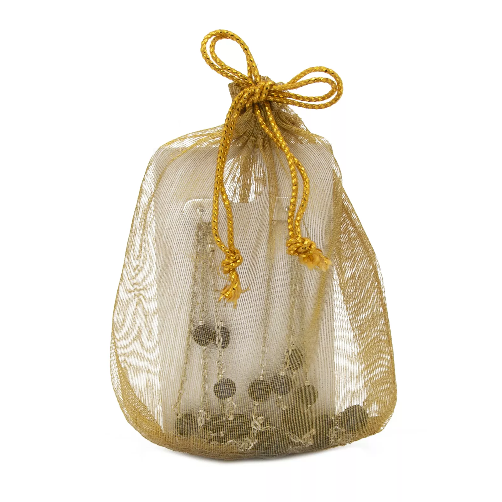 This accessory set from Canyon Sky includes a crossbody bag and layered necklace in coordinating colors. The handbag comes in blue cotton denim detailed with a Southwest inspired design featuring blue, cream, and red colors. The exterior of the bag has multiple pockets, one snap close fold-over, one small zip pocket with a slip pocket, and one larger zip pocket. The main compartment is large, fabric lined, and roomy with a zip closure and small interior zip pocket. The denim adjustable shoulder strap is 3/4-inch wide and is 60-inches long giving you a comfortable crossbody or shoulder carry option. Finish the look with a matching 24 + 3-inch extender layered necklace featuring three strands of blue beads on a rolo silver-toned chain with a lobster claw closure and matching 3" dangle drop earrings with fish hook backings. Bag dimensions: 12" W x 10" H x 4" D.