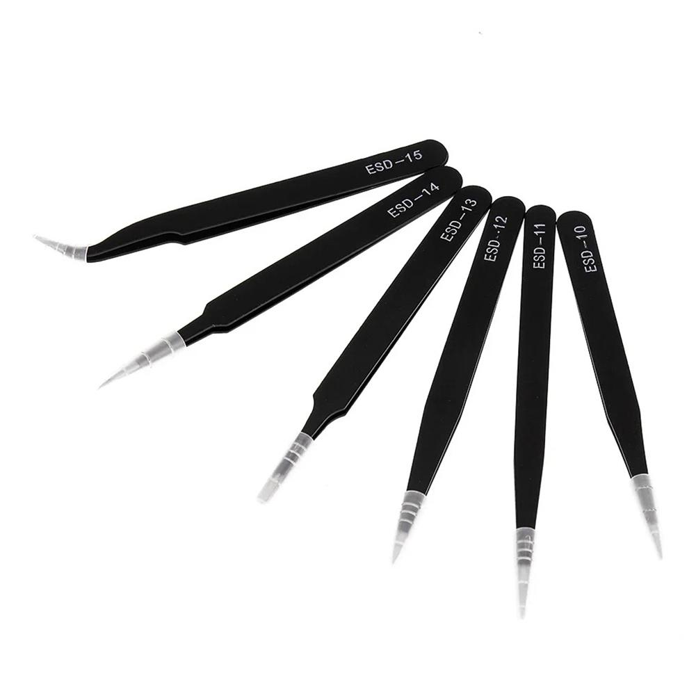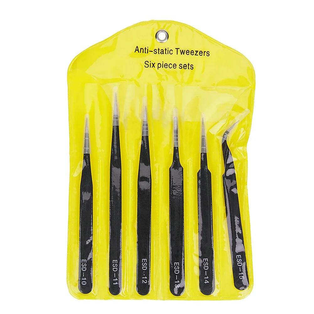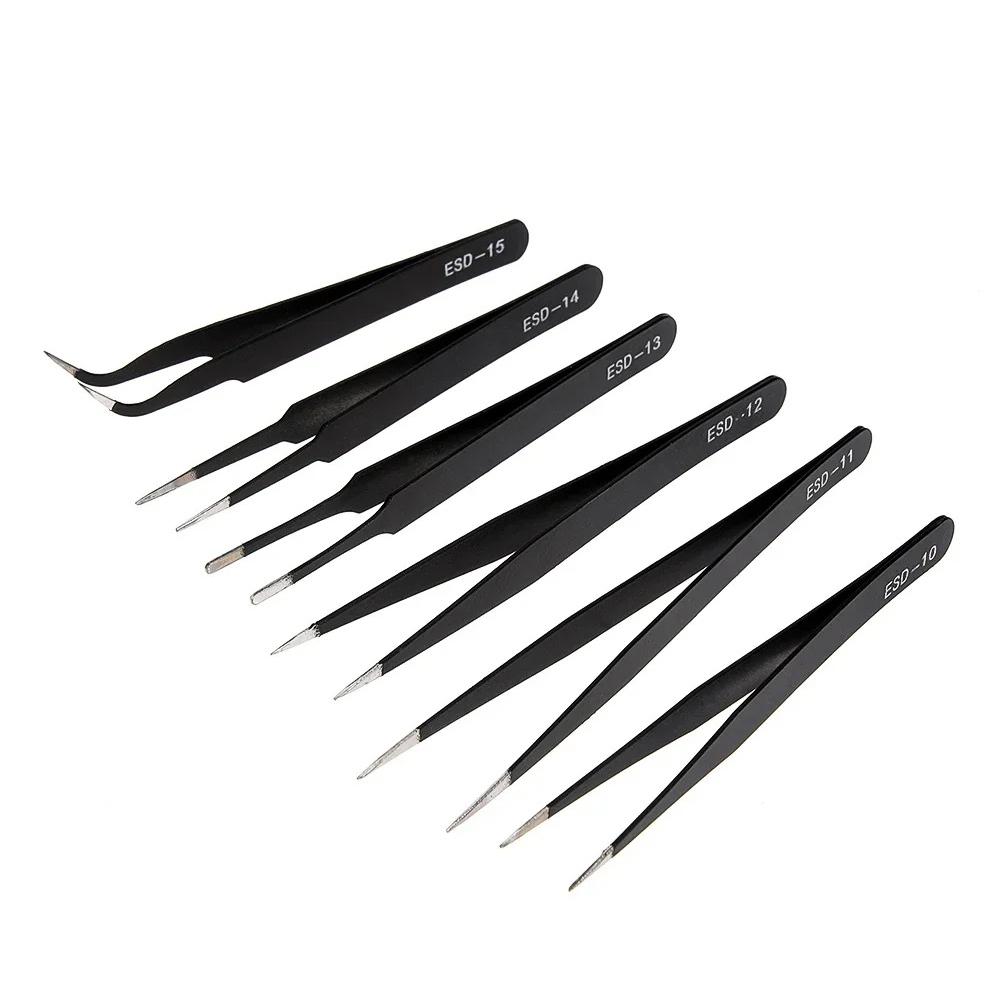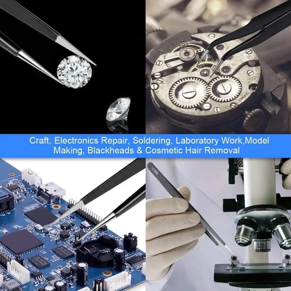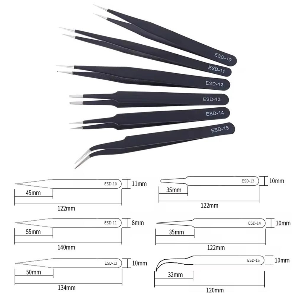 These ESD Tweezers set with ESD (Electrostatic Discharge) finish to protect the components and handles from the damaging effects of static.