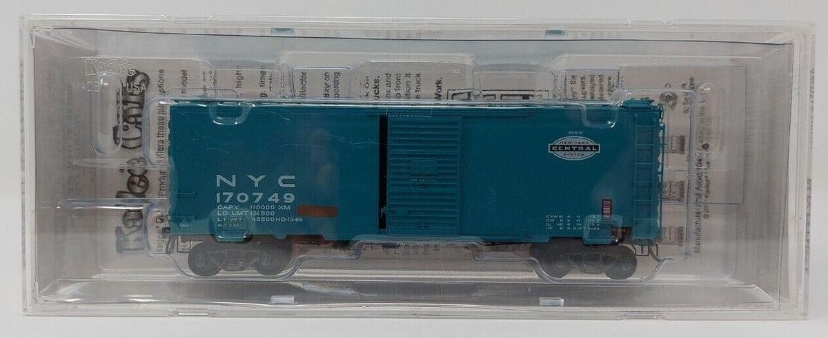 This is a Kadee 4084 HO Scale Pullman-Standard 40' PS-1 Boxcar with 6' Youngstown Door New York Central #170749 (Century Green). This boxcar features: Sprung Kadee Couplers w/Replacement Springs, Pre-installed plastic, durable, grab irons, Plastic, durable, ladder detail with incredible bolt detail, Operating doors, Smooth running metal wheels with plastic axles, Real-working Kadee sprung trucks, Legible font and fine, crisp, lettering and stenciling of logos, See-through plastic walkways and platforms, durable, A load of under body piping and detail with plastic, lose but snug, Detailed trucks, Air Hose detail, Prototypical accurate paint, lettering, logos, numbers, and data, Realistic resin body pre-made or in kit format, Accurate colors, Detailed brake wheel and system, and it comes Durably stored in a safe hard plastic container with prototype information and tips on the boxcar.