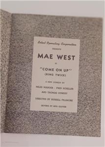 VINTAGE AND ORIGINAL 1946 SOUVENIR PROGRAMS FROM KANSAS CITY FOR COME ON UP (RING TWICE) THEATRE TRY OUT PLAY STARRING AND PICTURING MAE WEST AND CONSISTING OF THE ILLUSTRATED SOUVENIR PROGRAM APPROX 10.75" X 8.5" AND A SMALLER PLAYBILL PROGRAM APPROX 6" X 9" NICE PHOTOS AND BIO INFO IN THE SOUVENIR PROGRAM. PROGRAMS ARE IN GOOD TO VERY GOOD CONDITION WITH NO WRITING INSIDE PLEASE SEE PICTURES FOR FULL DESCRIPTION. POSTAGE $7.50 IN THE UNITED STATES AND BY ARRANGEMENT OVERSEAS.