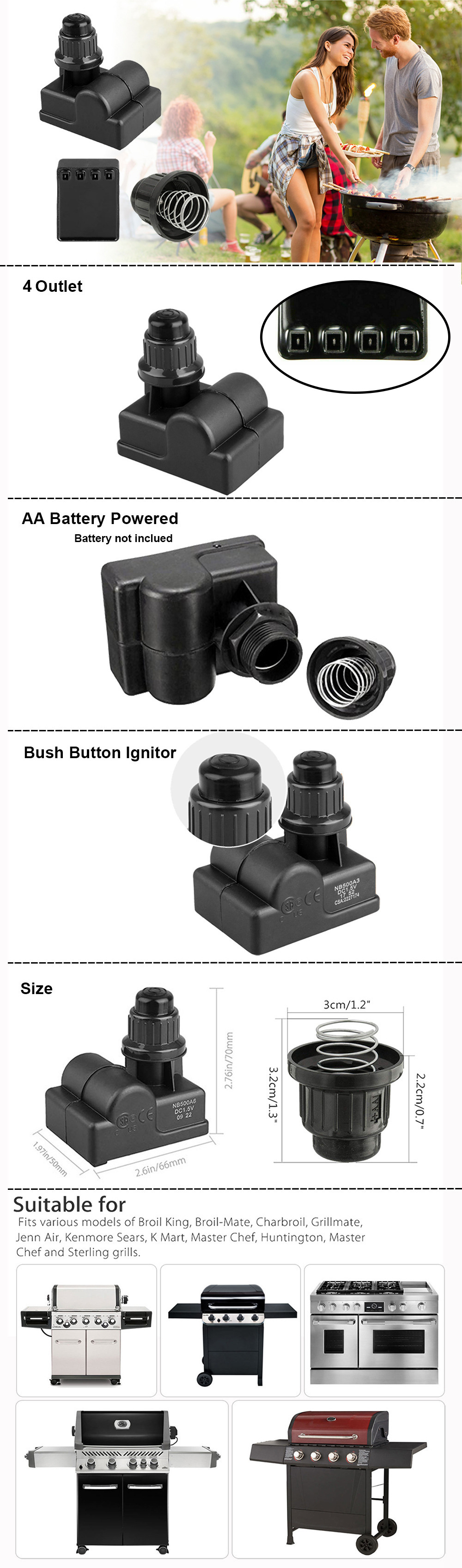 Product Description Universal Spark generator BBQ Gas Grill Replacement 4 Outlet "AA" Battery Push Button Ignitor (Battery not include) 7/8" diameter mounting hole. CSA Certified, Durable and Lasts Longer. Universal push-button for Weber, Amana, Uniflame, Surefire, Charmglow, Char broil, Centro, Grillmaster, Aussie, Kenmore, Lowes, Nexgrill, Brinkmann, BBQ Pro, Bakers, Grillware, Chefs, Jenn Air, Huntington, BBQ Grillware GGPL-2100, Jenn-Air JA460, Kenmore Elite grill, Ducane Affinity 4100 natural gas grill and Other grills Amana Part Numbers: AM26LP AM27LP AM30 SS4 Brinkmann Parts: 810-1575-W 810-2210-0 810-2210-1 810-2235-0 810-2250-0 810-2250-1 810-2250-2 810-2300-0 810-2300-B 810-2310-0 810-2310-1 810-2390-S 810-2400-0 810-2400-2 810-2500-0 810-2500-1 810-2705-1 810-4435-3 810-4436-E 810-4675-0 810-6305-T 810-6320-V 810-6330-B 810-6330-W 810-6345-0 810-6345-T 810-6355-T Nexgrill Parts: 810-6320-V 810-6330-B 810-6330-W 810-6345-0 810-6345-T 810-6355-T 720-0679B 720-0679R 720-0718 720-0718A 720-0718C 720-0718N 720-0737 720-0825 Char-griller Parts: 2903 3000 3001 3008 3030 3072 4000 4001 4008 4208 5030 5050 5072 5252 5650 Master Chef Parts: 85-3044-6 85-3045-4 B401S G43215 G43216 G45101 G45303 G45304 S482 T420 T420LP T620LP Grill Chef Parts: BIG-8116 SS525-B SS525-BNG SS54-LP SS639 SS64-LP SS64-NG Academy Sports Parts: B070E4-A B09LB1-32-4 B09LB1-32 BQ04022 Amana Parts: AM26LP AM27LP AM30 SS4 Aussie Parts: 6703T8DV31 6804 6805-8SSS1 6805 Suitable Models of BBQ gas grills: Fits brands: Academy Sports, Amana, AussieBlue Ember, Brinkmann, Capt'n Cook, Centro, Char-Griller, Charbroil, Charmglow, Coleman, Cook-On, Costco, Cuisinart, Ducane, Dyna-Glo, Fiesta, Four Seasons, Front Avenue, Grand Hall, Great Outdoors, Grill Chef, Grillmaster, Home Depot, Jenn-Air, King Griller, Kmart, Lowes, Master Chef, Master Forge, Nexgrill, Outdoor Gourmet, Patio Chef, Patio Range, Perfect Flame, Perfect Glo, President's Choice, Range Master, River Grille, Sams, Smoke Hollow, Sterling Forge, Sterling, Stok, Sure Heat, Surefire, The Source, Thermos, Turbo, Tuscany, Uberhaus, Uniflame, XPS ★ Notice ★ Make sure you measure the size and check the shape of your original parts and compare with ours BEFORE you order |