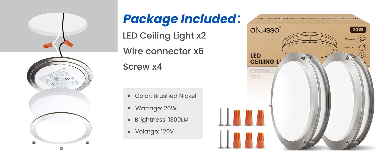 | Package Content | 2 x LED Ceiling Light 6 x Wire connectior 4 x Screw |