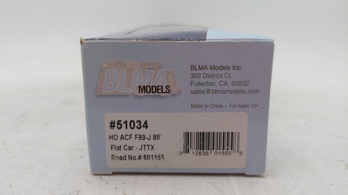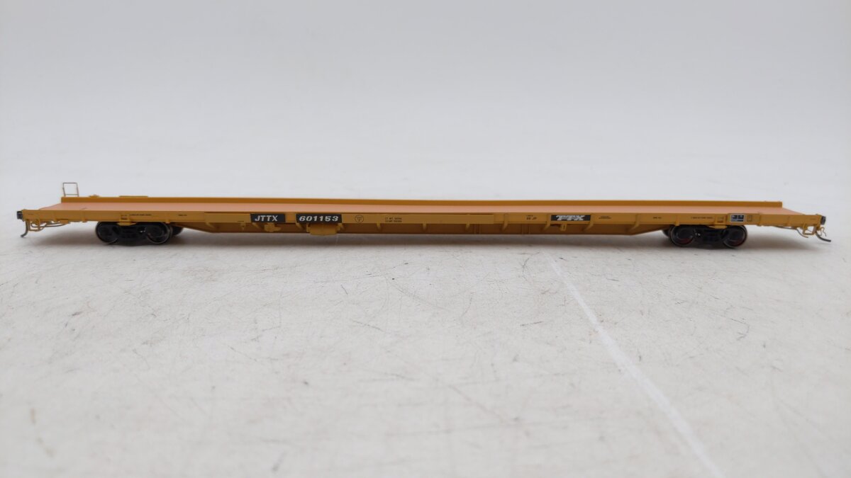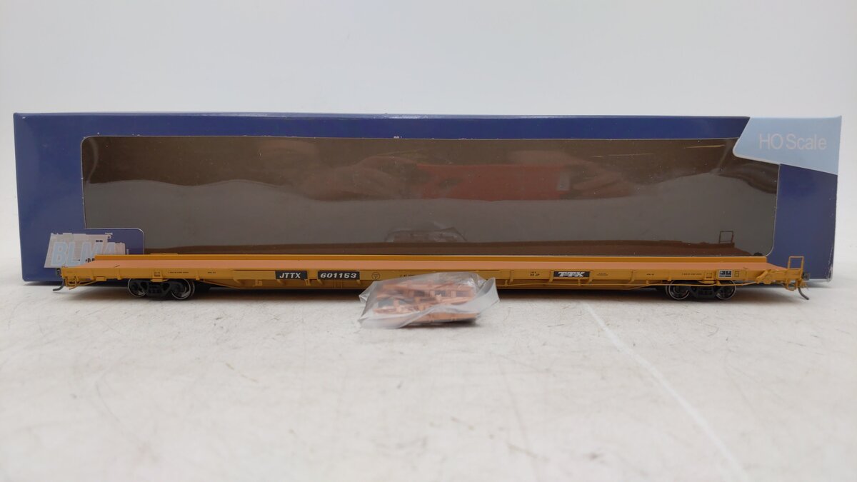 This is a BLMA 51034 HO Scale ACF F89-J 89' Flatcar w/Bulk/Pipe Riser Details - Ready to Run Trailer-Train JTTX #601153 (yellow, black; TTX Logo). JTTX flat cars were designed to carry pipe and bulk loads! The ACF F89-J, 89’ Flat Cars were built in the late 1960’s for intermodal service. By the 90’s, Trailer Train Company found other uses for the ‘89-J’ and its flat brethren through the JTTX, and other re-purposed program. Fitted with wood crossbeams, the JTTX fleet was designed to accommodate pipe and bulk loads of varying diameter and weight. Featuring new, side-mounted brake rigging and other JTTX-specific detail, these models roam the rails today, delivering pipe and bulk loads all over North America. Model Features: • First Ever JTTX Flat in Any Scale!• Accurate Details For Bulk Loads• Razor Sharp Printing & Lettering• HO Scale: Kadee #156 Couplers• 70-Ton Trucks w/33 Metal Wheels• 12 Unique Road Numbers!