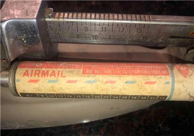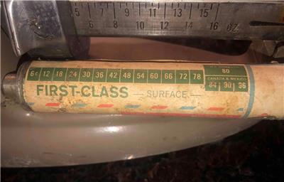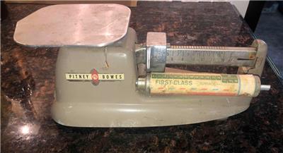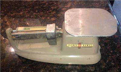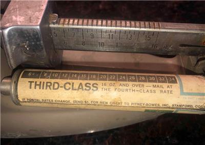 Nice estate find! According to our research this appears to be a MODEL 4900 Pitney bowes table top mechanical postal scale complete with mailing rates for FIRST, AIRMAIL, and 3rd CLASS dating from 1968-1971. Adjustment wheel moves smoothly. Normal wear and tear with light surface rust underneath. Could use a good cleaning/polishing. Functional retro collectible!