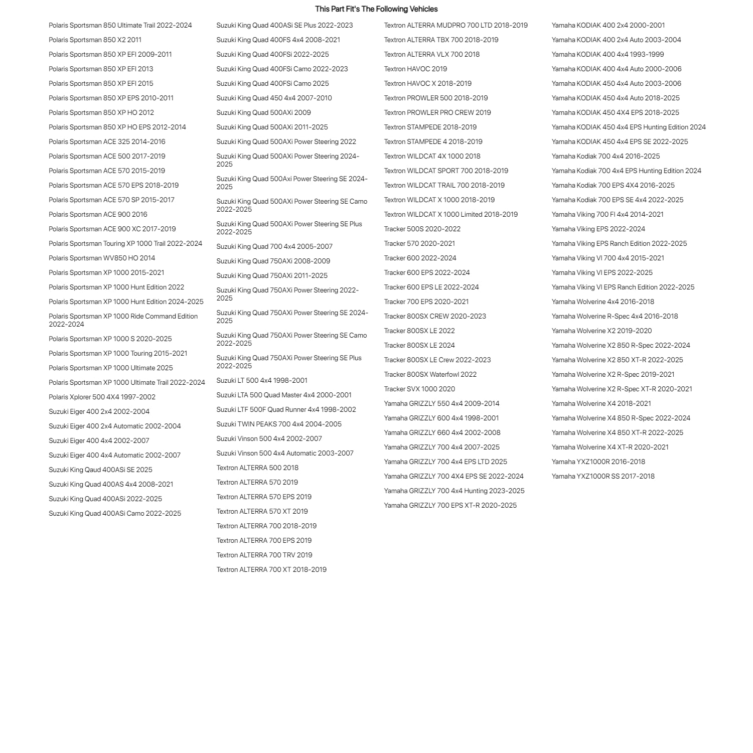 Special Notes:Please note: Tire sizes vary by machine please check your current tire and wheel size before ordering.Adding oversize tires may alter the handling characteristics of your factory equipped vehicle. Extreme care must be used to prevent loss of control or roll over during sharp turns or abrupt maneuvers. Oversize tires may rub under extreme steering angles, and extreme suspension compression.The TUSK Trilo