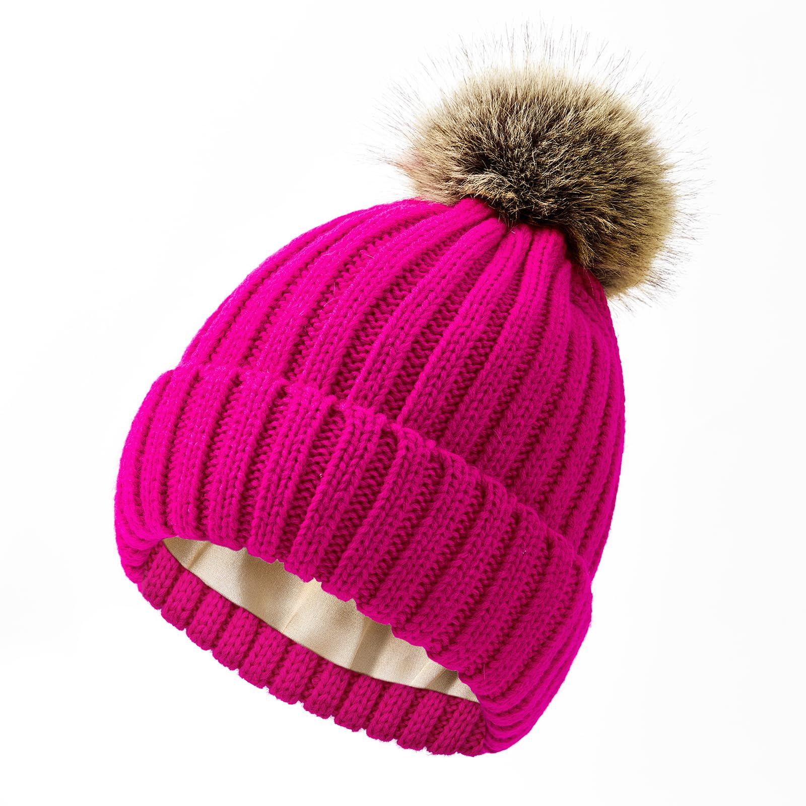 Satin Lined Beanie for Women Knit Winter Hats Warm Soft Womens Beanie with Detachable Pom Pom
