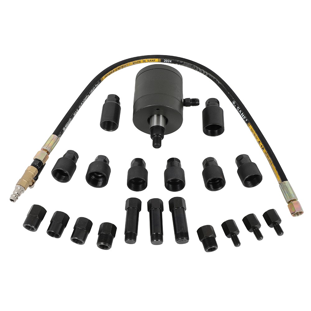Pneumatic injector puller comes with various size adapters to suit various injector sizes, including: M20*1.0, M18*0.75, M17*1.0; M8*1.25, M8*1.0, M8*1.5; M14*1.5, M16*1.5, M18*1.5, M20*1.5, M22*1.5; M25*0.5, M25*1.0; M26*0.75, M29*1.0, M31*0.75; M27*0.75, M27*1.0.a